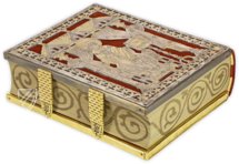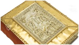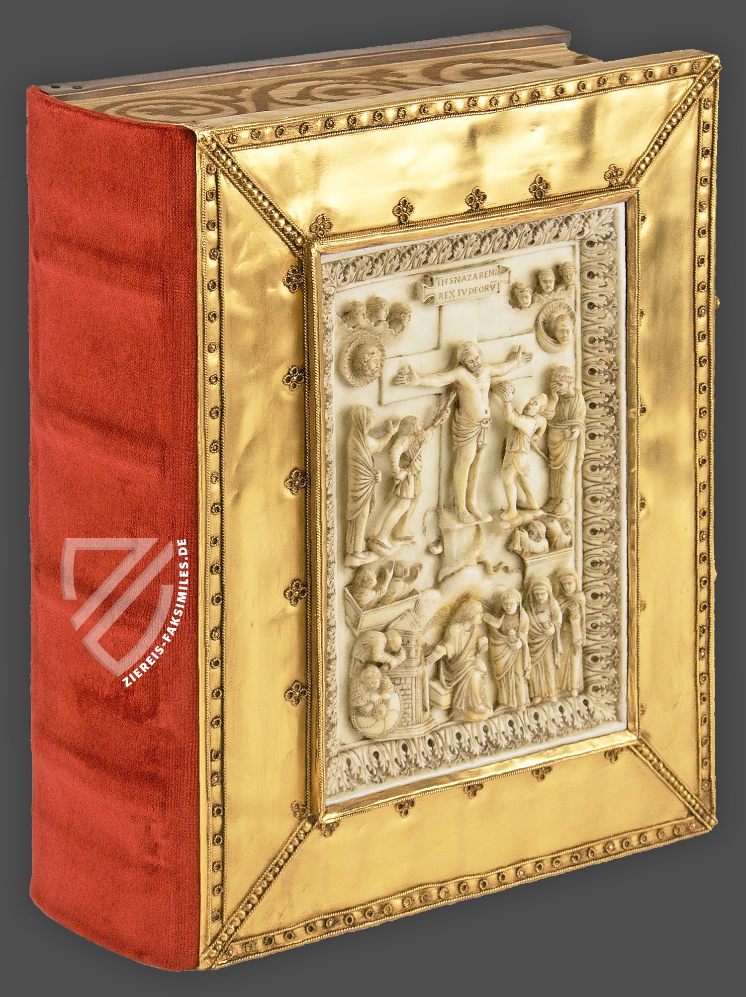 Geschützt werden die Seiten der Prachthandschrift durch einen Einband, der dem Inhalt des Buches würdig ist. In einer Goldfassung ist auf der Vorderseite ein Elfenbeinrelief eingelassen, das zeitlich wohl kurz vor der Handschrift zu datieren ist. Zum Thema hat es im oberen Register die Kreuzigung Christi und zeigt darunter die Szene der Frauen am Grabe. Die Rückseite des Einbandes wird geschmückt durch eine teilweise vergoldete Silberarbeit, die den schon im Buch dargestellten Papst Gregor den Großen zeigt.