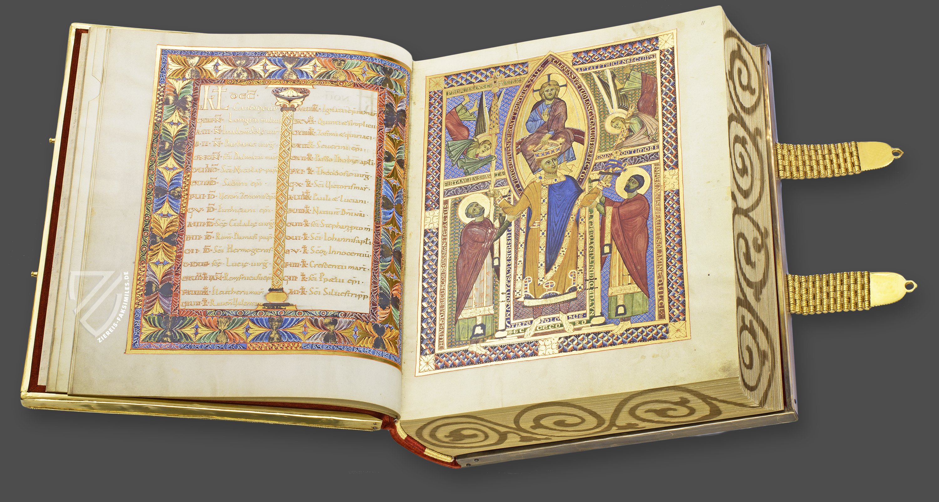 Das bemerkenswerte Krönungsbild macht die königliche Stiftung auf den ersten Blick deutlich: Heinrich wird von den heiligen Bischöfen Ulrich und Emmeram gekrönt und mit den Reichskleinodien, der heiligen Lanze und dem Reichsschwert, ausgestattet. Das Thronbild zeigt den König in seiner vollen Pracht und Macht. Und das Autorenbild von Gregor dem Großen, dem legendären Verfasser des Sakramentars, stellt einen weiteren großen Namen in diese Reihe.