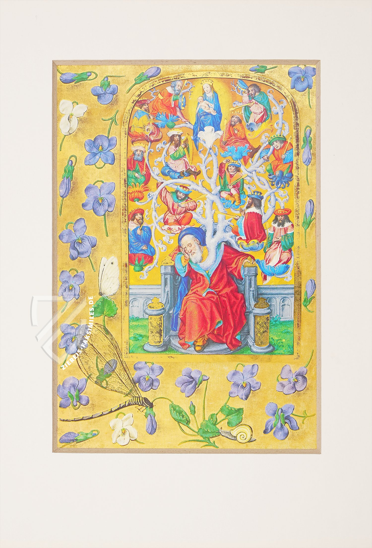 Die Einzelblattsammlung Schätze der Buchmalerei - Geheimnisvolle Begegnungen vereint vier wunderbare und opulent mit Gold illuminierte Seiten aus vier herausragenden Handschriften der berühmten vatikanischen Bibliothek. Die ganzseitigen Miniaturen werden jeweils von kunstvollen floralen Bordüren eingefasst und zeigen allesamt christliche Ikonografien: David erscheint frontal als König, flankiert von zwei weiblichen Figuren; die Wurzel Jesse wächst als weißer rankenartiger Baum aus der schlafenden, thronenden Figur; in einer weiten sattgrünen Landschaft erscheint Maria Bernhard von Clairvaux in einem Reigen von Engeln; die Ereignisse des letzten Abendmahls werden begleitet von einer Bas-de-page-Miniatur von Christus im Garten Gethsemane, während sein Einzug in Jerusalem bereits durch das Fenster im Hintergrund zu sehen ist. Ein wunderbarer Einblick in die einzigartige apostolische Sammlung christlicher Buchschätze.