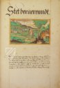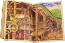 Diese reich kolorierte doppelseitige Miniatur (mit einem dritten ausklappbaren Teil) zeigt die beeindruckende Maschinerie des Schwazer Silberbergwerks im Inneren des Berges. In der oberen linken Ecke wurde ein unterirdischer Bach umgeleitet, der zwei riesige WasserrĂ€der antreibt. Sie liefern die Energie fĂŒr KrĂ€ne, die Eimer und SĂ€cke voller Silbererz fĂŒr die Bergleute heben und absenken.