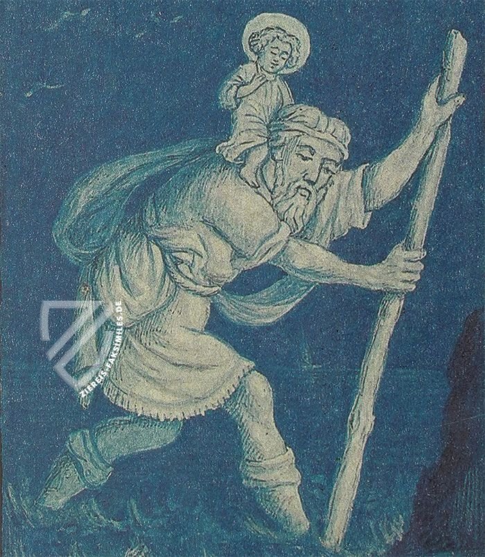 Der Legende nach trug der Heilige Christophorus ein unbekanntes Kind auf seinem Rücken über einen Fluss, bevor sich das Kind als Christus zu erkennen gab. Seitdem gilt er als Schutzpatron der Reisenden, die oft Bilder von ihm mit sich führen. Auch wenn dieses Bild die typische Haltung des Heiligen zeigt, der einen gefährlichen Fluss von links nach rechts mit einem Kind auf den Schultern überquert, wurde diese Szene nur mit Blau und Weiß gestaltet, was in Kombination mit den Gesichtsausdrücken einen ruhigen und gelassenen Eindruck vermittelt.