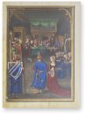 Die reizvolle Bilderfolge von Kalendermotiven präsentiert verschiedenste charakteristische Tätigkeiten und Tierkreiszeichen, die mit dem jeweiligen Monat in Verbindung stehen. Meist werden landwirtschaftliche Tätigkeiten wie die Bestellung von Acker und Feld dargestellt. Ebenso zeigen die Miniaturen auch monatstypische Vergnügungen und gesellschaftliche Großereignisse. Den Freizeitaktivitäten der oberen Schicht der Gesellschaft kommt in Benings Kalender vergleichsweise mehr Platz zu als der ganzjährlichen Feldarbeit. Bild für Bild offenbart sich hier eine geschäftige und harmonisch geschlossene Gesellschaft. Holzhacker in der freien Natur, Bauern auf verschneiten Feldern sowie Personen, die sich in einem nahegelegenen Innenraum an einem Feuer wärmen – diese Miniatur illustriert beispielsweise den Monat Januar. Auch andere Motive, wie die Liebeswerbung, wurden von Bening in szenischer Buchmalerei umgesetzt. Man sieht Liebespaare in einem Garten, bei einer romantischen Bootsfahrt oder beim Tanz auf einem Ball in einem eleganten flämischen Haus. Die atmosphärisch dichten Bilder in subtilen Farben wurden von keinem Illuminator des Mittelalters je übertroffen.