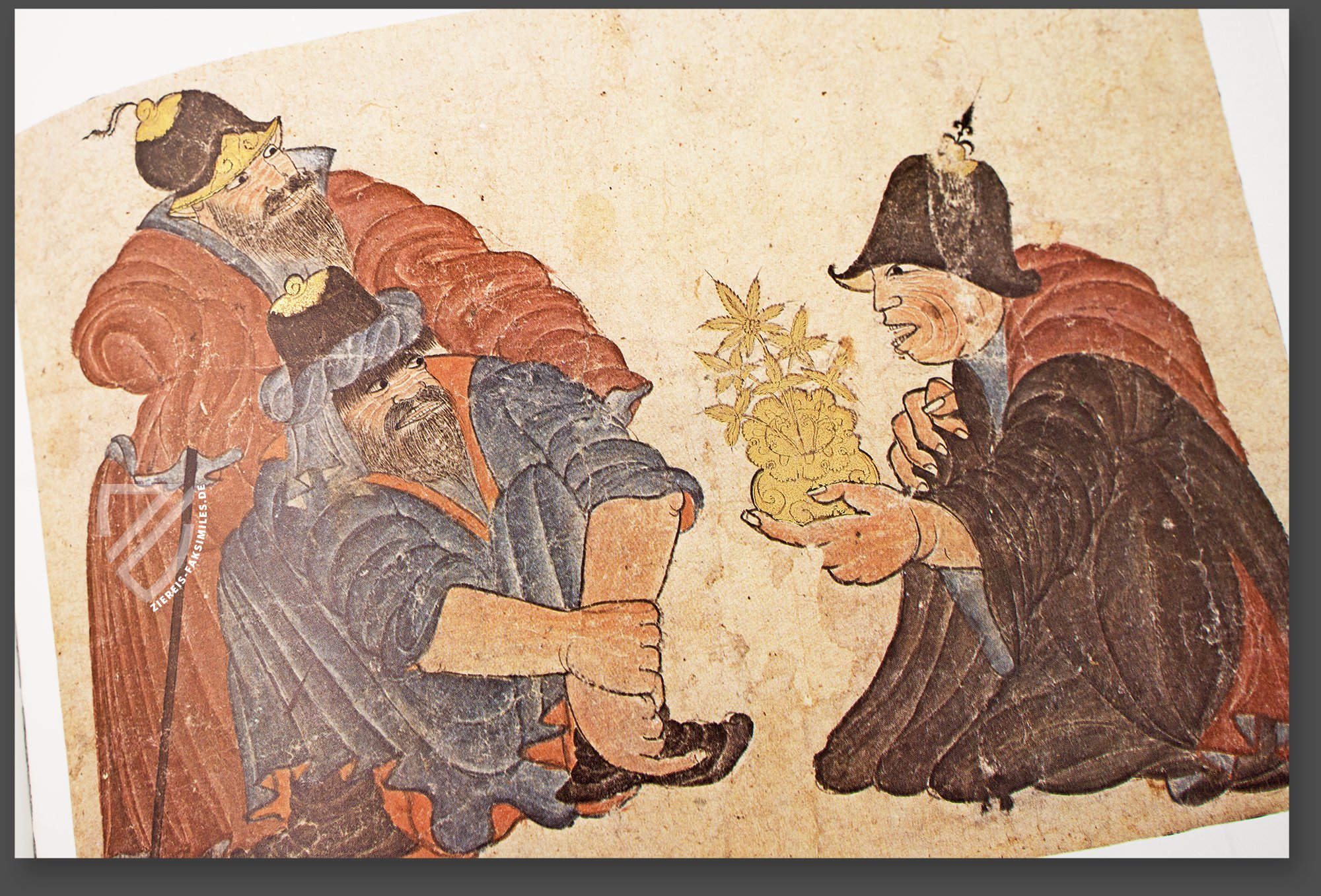 Ein großes Geheimnis umgibt diese mongolischen Malereien des frühen 15. Jahrhunderts: sie stammen vom bedeutendsten mongolischen Künstler der Zeit, Meister Muhammad Siyah Qalam, die Schwarze Feder. Auf 80 Blättern eröffnet sich in den wunderbaren farbigen Malereien die exotische Welt Zentralasiens, in Bildern vom Leben der Nomaden und ihrer Kultur und Religion. Ein einmaliges Zeugnis dieser spannenden Epoche!