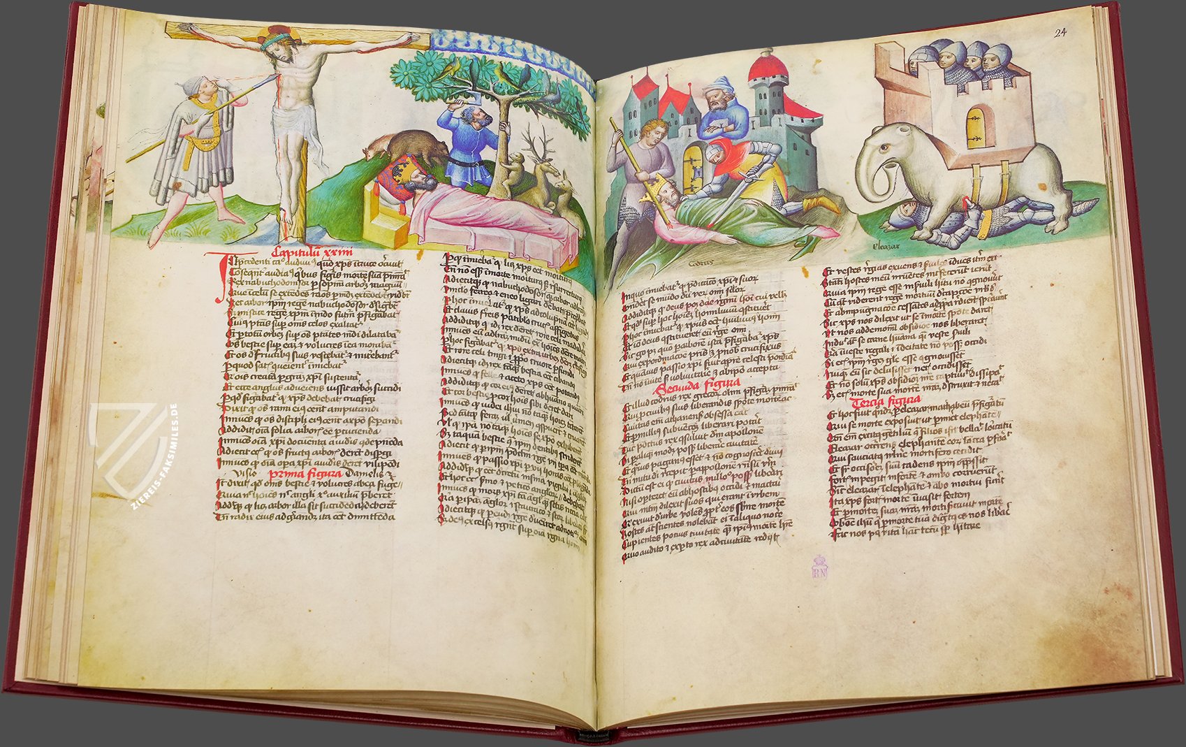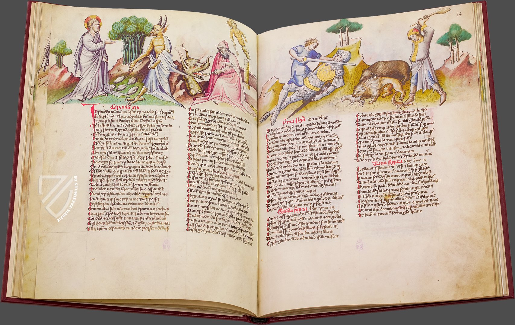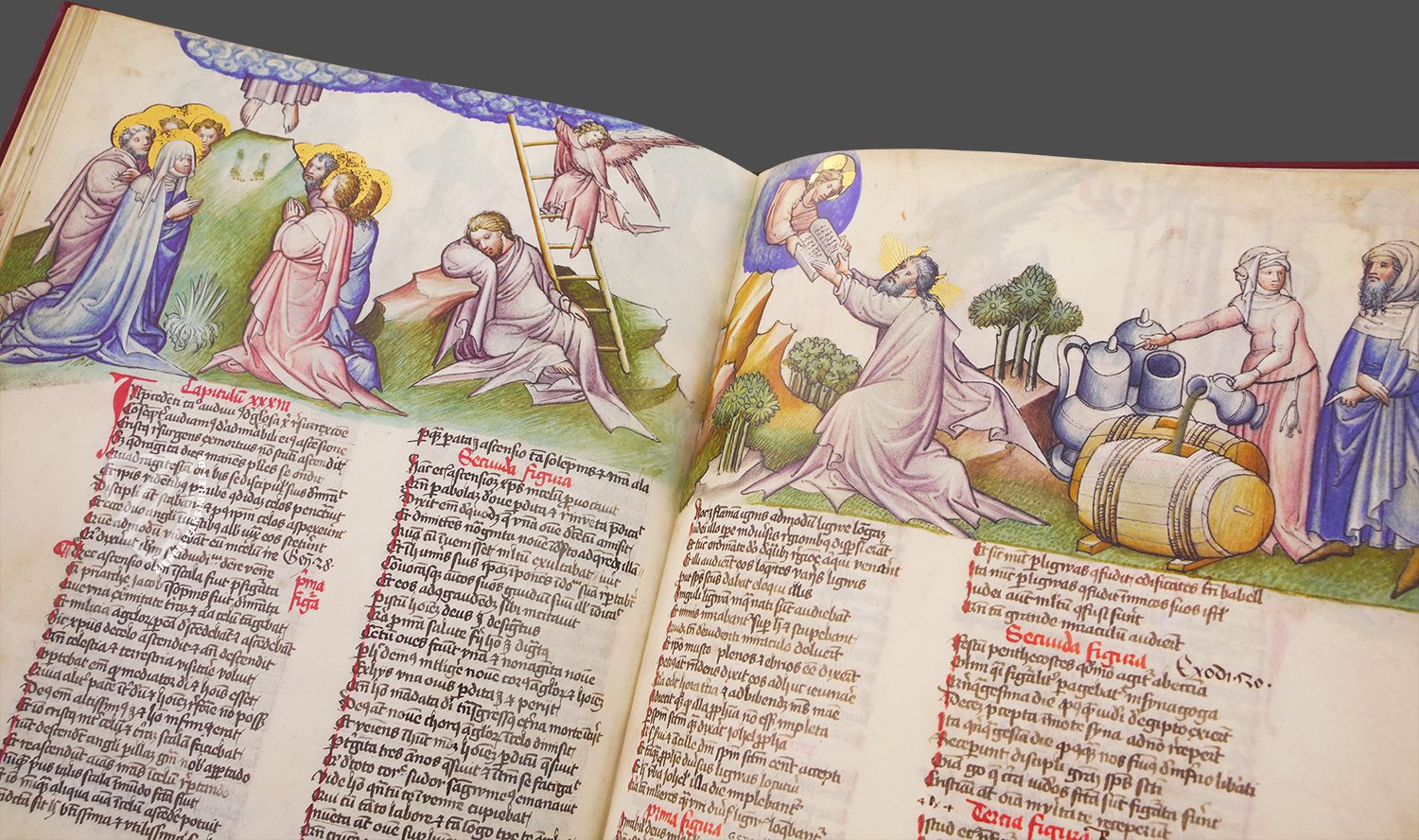 Der einzige Spiegel des menschlichen Heils, der in Spanien erhalten geblieben ist: das beeindruckende Speculum Humanae Salvationis der spanischen Nationalbibliothek. Dieses herausragende Exemplar des beliebten und einflussreichen Textes, der ein moralisierender Leitfaden für die Christen Europas im Mittelalter war, entstand ca. 1432 entweder in Wien oder Innsbruck und ist mit 264 Miniaturen reich verziert. Diese feinen, mit Gold akzentuierten Gemälde illustrieren die Geschichten des Alten und Neuen Testaments sowie die Themen der antiken Mythologie. Sie sind im oberen Drittel jeder Seite als Fries über dem zweispaltigen lateinischen Text angeordnet. Die biblischen Szenen sind im 15. Jahrhundert angesiedelt, mit gotischen Architekturelementen, eleganten Edelfrauen in stilvollen Kleidern und Rittern, die mit zeitgenössischen Waffen und Rüstungen ausgestattet sind. Die Handschrift ist ein herausragendes Beispiel für die deutsche Miniaturmalerei dieser Zeit und bietet einen wertvollen Einblick in das Leben im Spätmittelalter.