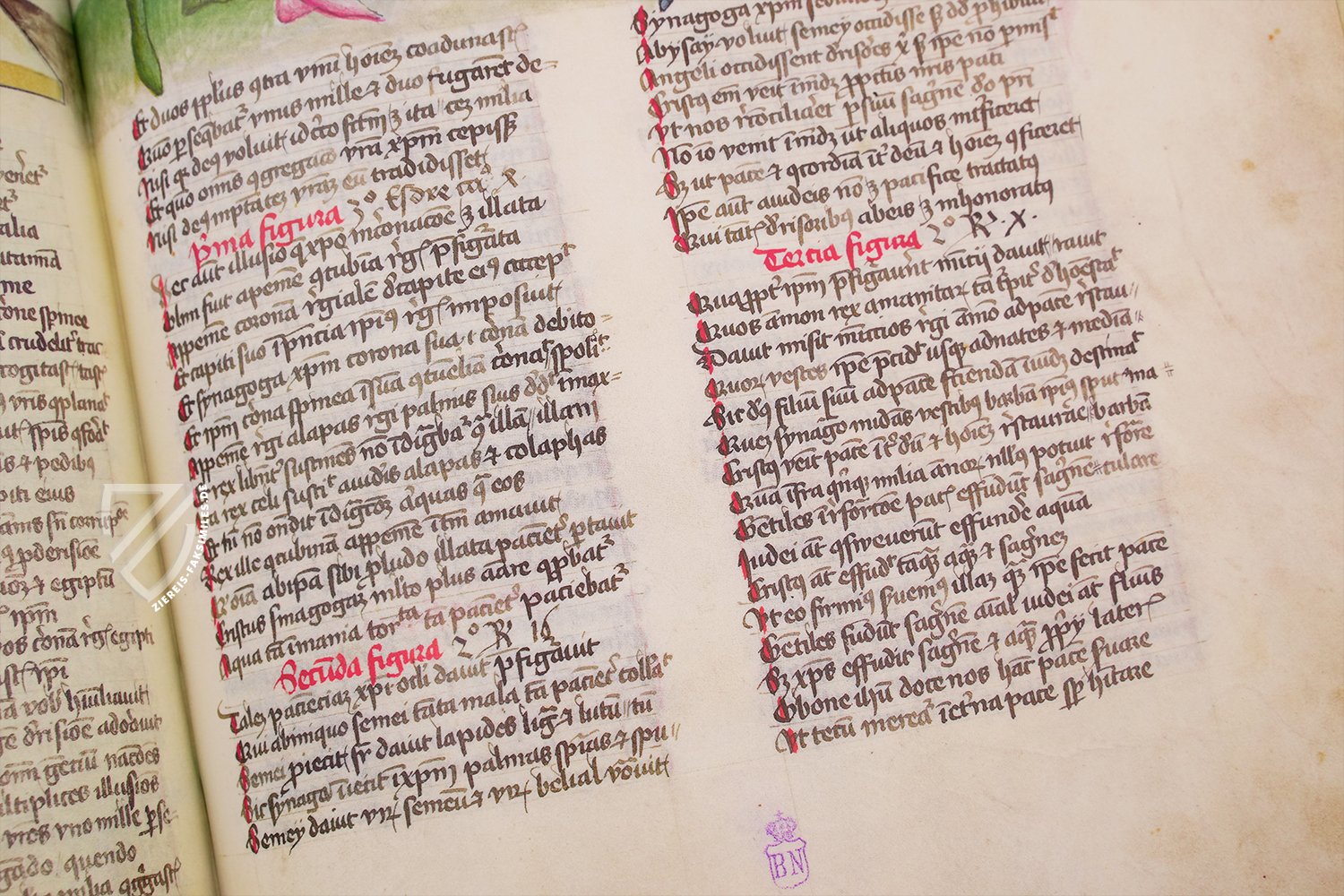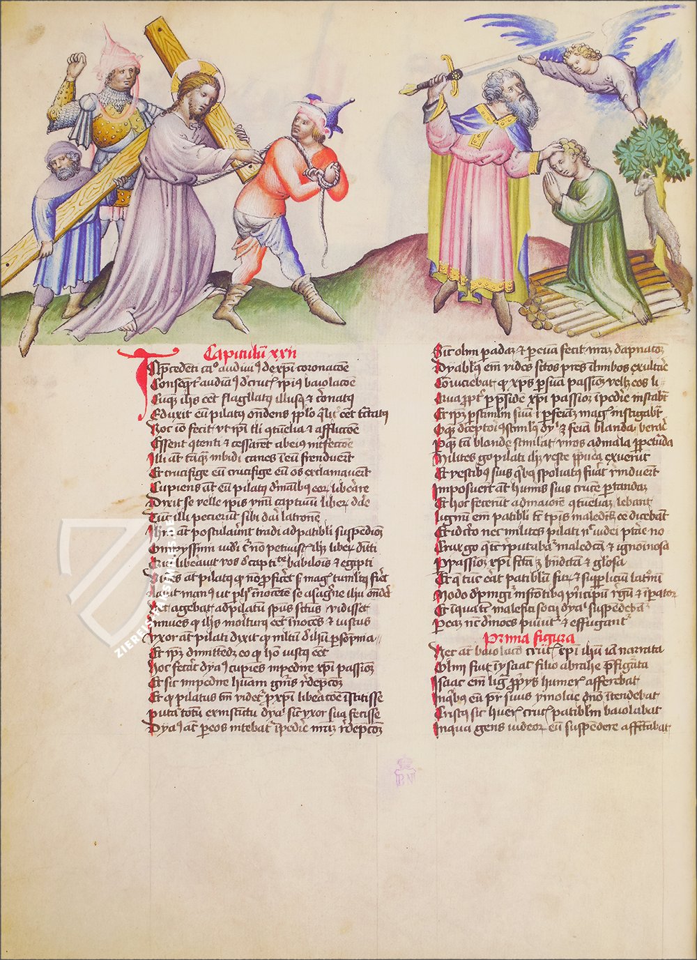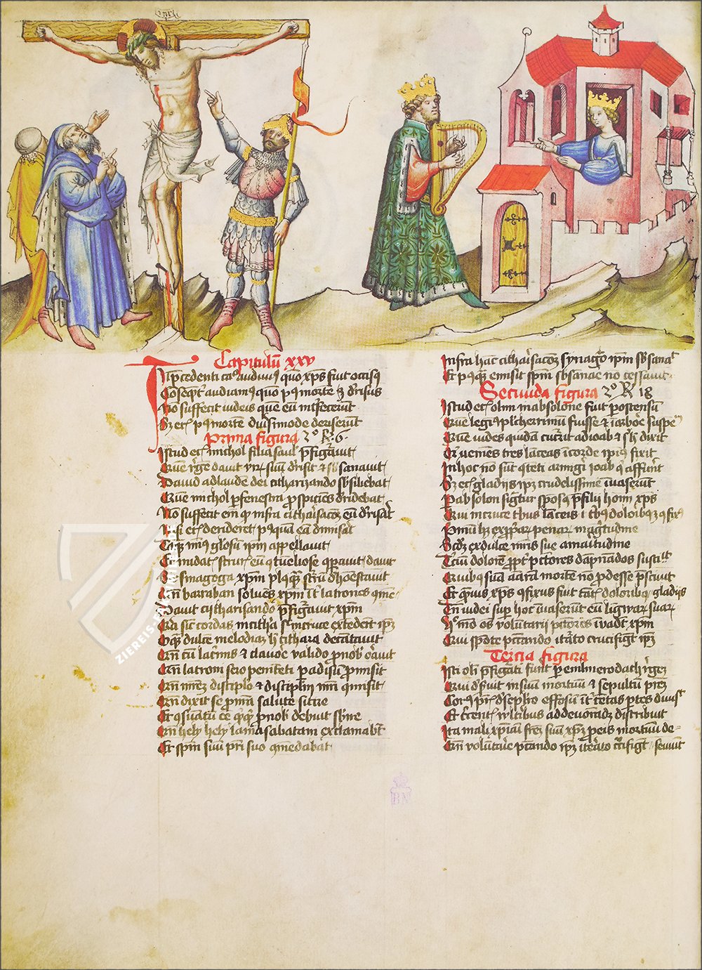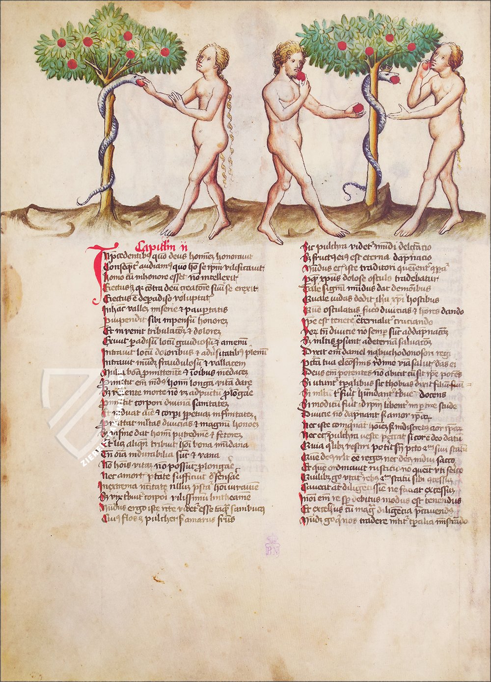 Der einzige Spiegel des menschlichen Heils, der in Spanien erhalten geblieben ist: das beeindruckende Speculum Humanae Salvationis der spanischen Nationalbibliothek. Dieses herausragende Exemplar des beliebten und einflussreichen Textes, der ein moralisierender Leitfaden für die Christen Europas im Mittelalter war, entstand ca. 1432 entweder in Wien oder Innsbruck und ist mit 264 Miniaturen reich verziert. Diese feinen, mit Gold akzentuierten Gemälde illustrieren die Geschichten des Alten und Neuen Testaments sowie die Themen der antiken Mythologie. Sie sind im oberen Drittel jeder Seite als Fries über dem zweispaltigen lateinischen Text angeordnet. Die biblischen Szenen sind im 15. Jahrhundert angesiedelt, mit gotischen Architekturelementen, eleganten Edelfrauen in stilvollen Kleidern und Rittern, die mit zeitgenössischen Waffen und Rüstungen ausgestattet sind. Die Handschrift ist ein herausragendes Beispiel für die deutsche Miniaturmalerei dieser Zeit und bietet einen wertvollen Einblick in das Leben im Spätmittelalter.