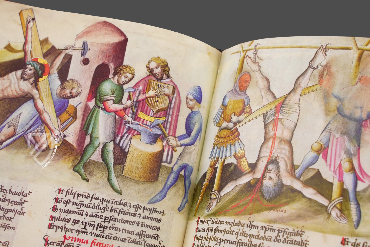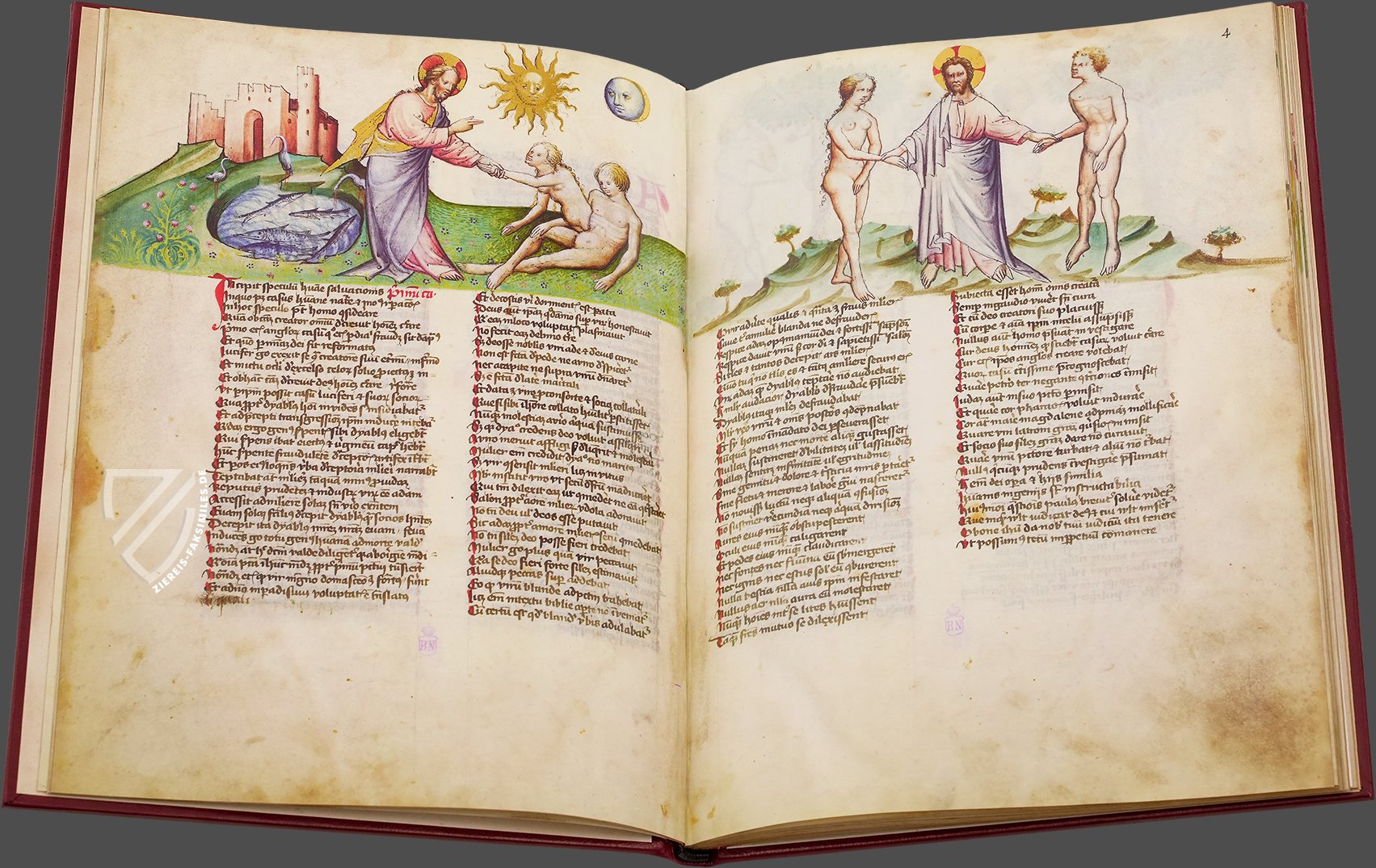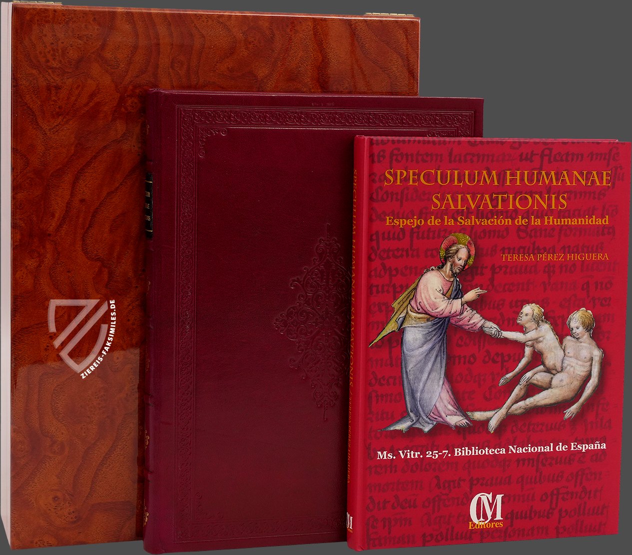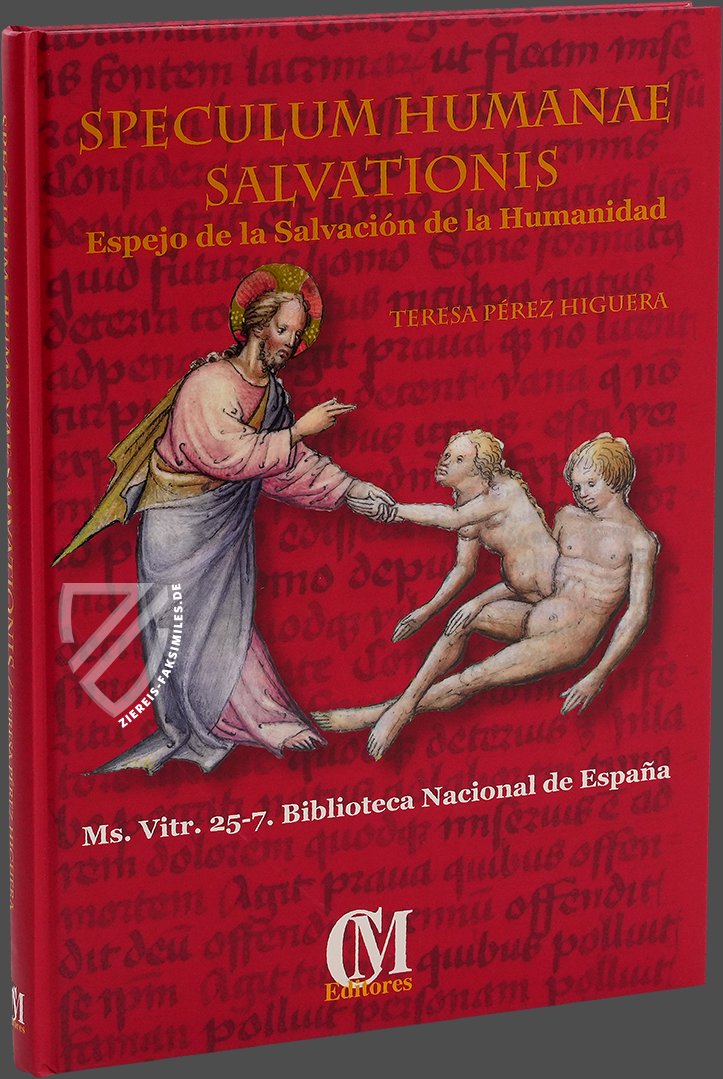 Unter der Signatur ms. Vit 25–7 wird diese einzigartige Handschrift in der Biblioteca Nacional de España in Madrid aufbewahrt. Entstanden ist die Handschrift jedoch nicht in Spanien, sondern im heutigen Österreich, nämlich in Wien oder Innsbruck im Jahre 1432. Die 68 Pergamentseiten des Speculum Humanae Salvationis sind überreich illustriert mit mehr als 250 wunderschön kolorierten Miniaturen. Diese erstrecken sich aneinandergereiht als Bilderfries am oberes Drittel jeder Seite über dem lateinischen Text in zwei Kolumnen. Ein herausragendes Beispiel der deutschen Miniaturmalerei der Zeit!