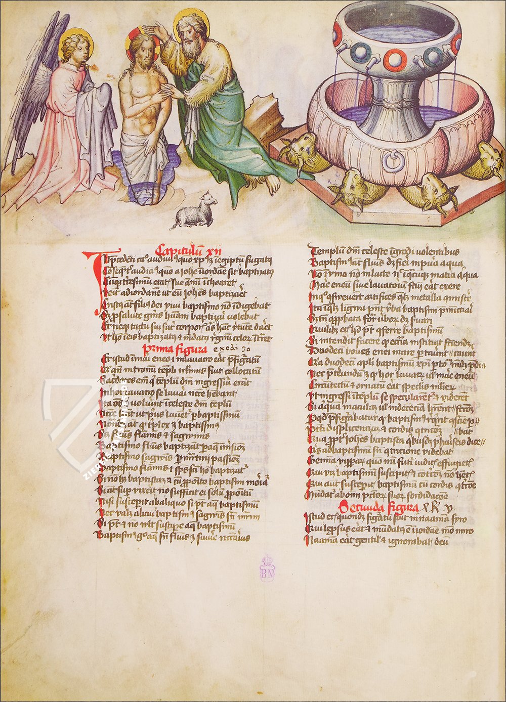 Auf der linken Seite ist eine typische Szene zu sehen, in der Johannes der Täufer Jesus im Jordan tauft, während ein Engel als Zeuge dient und mit trockenen Gewändern schon bereitsteht. Ein kleines Lamm dient als symbolische Erinnerung an das Opfer Christi. Rechts daneben befindet sich ein Brunnen mit den Köpfen von vier Ochsen - eine ungenaue Darstellung des so genannten Geschmolzenen Meeres aus dem Tempel Salomos.