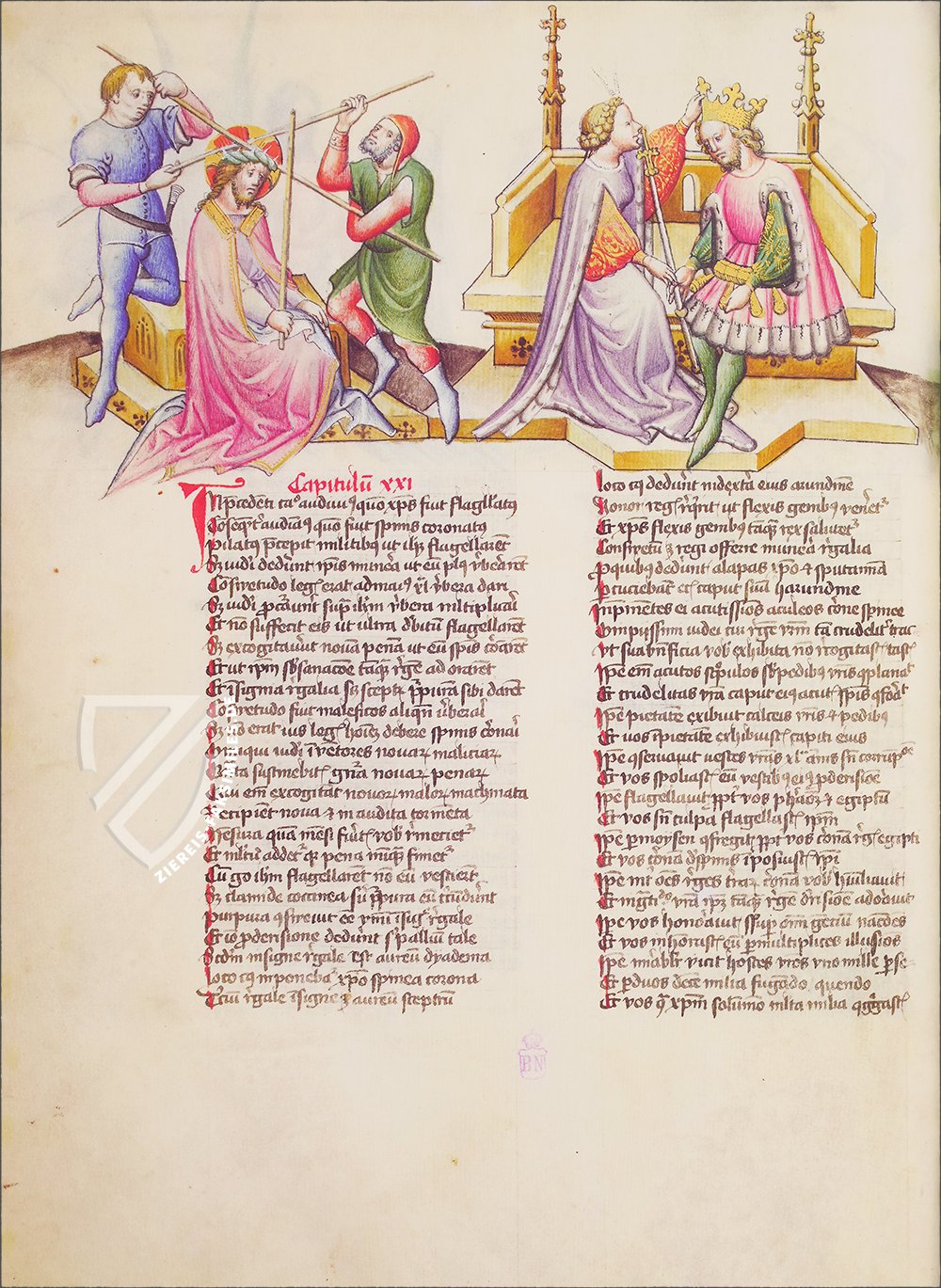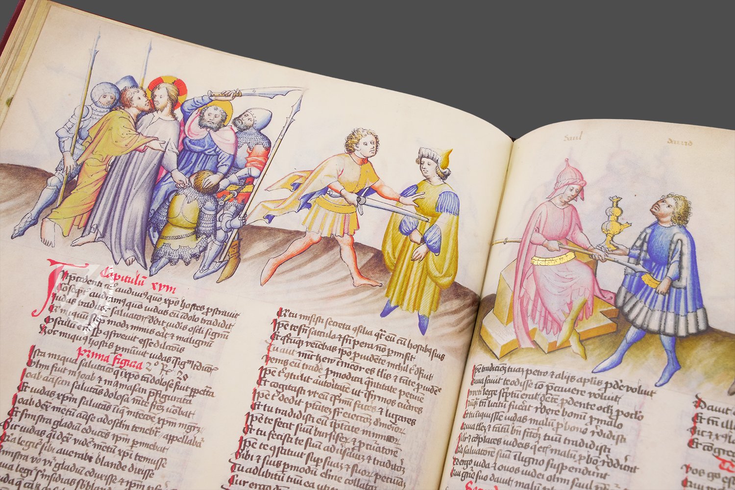 Die Miniaturen präsentieren die biblischen Geschichten ganz und gar im Gewand des Mittelalters. Ritter und Krieger in Kettenhemd und Rüstung, typische Gewänder des frühen 15. Jahrhunderts, eine stilistisch eindeutig mittelalterliche Krone und zahlreiche Architekturelemente mit gotischen Formen prägen diesen ungewohnten Eindruck. So begegnen dem Betrachter Heilige in Gestalt edler Fräulein und biblisches Geschehen vor mittelalterlicher Kulisse. Elegante, anmutige Figuren in fließenden Gewändern bevölkern die spannend angeordneten Szenen. Und zur Krönung dieses qualitätvollen Bildereigens sind zahlreiche Details in Gold hervorgehoben und verleihen den Seiten der Handschrift eine glanzvolle Anmut.