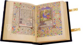 Der Stil der wunderbaren, spätgotischen Illumination der wunderschönen Handschrift lassen auf eine Herstellung in der Mitte des 15. Jahrhunderts schließen, da sie an die Kunst des berühmten Bedford-Meisters und seiner Werkstatt angelehnt sind. 22 goldgeschmückte Miniaturen aus leuchtenden Farben zeigen typische Stundenbuch-Ikonografien in bogenförmigen, subtilen Rahmungen. Jede einzelne Seite – ob Text- oder Bildseite – wird von wunderbaren, filigranen Blattrankenbordüren umschlossen, wobei keine der anderen gleicht. Ein Paradebeispiel französischer Buchkunst des 15. Jahrhunderts!