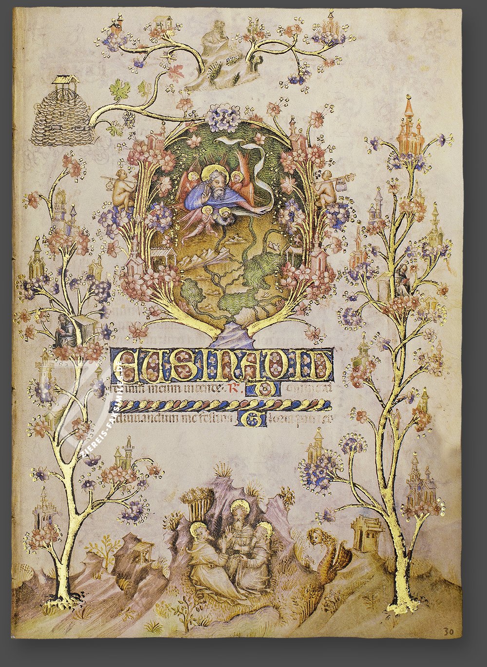 - 34 ganzseitige und zahlreiche halbseitigen Miniaturen, historisierte Initialen und Randillustrationen