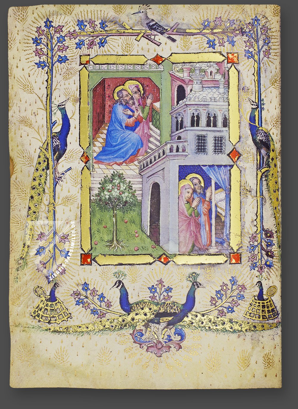 Die Prunkhandschrift verzaubert mit ihrer unglaublichen gestalterischen Vielfalt. 34 Seiten des Werkes sind mit ganzseitigen Illustrationen verziert. Die Seiten zeigen anmutige Darstellungen biblischer Motive in aufregend lebendigen Farben. Teils sind die Bilder golden hinterlegt. Prächtige Randverzierungen aus Blumen- und Pflanzenranken umrahmen die Miniaturen. Giovanni de Grassis´ Stil ist unverkennbar. Unter Einsatz transparenter und intensiver Farben, von einem etwas gedämpften, eher diffusen Licht beleuchtet, schuf er märchenhaft anmutende Landschaften mit hochnaturalistischen Szenerien. Seinem Nachfolger gelang es in diesem Manuskript, die Kunst des großen Meisters gebührend nachzuempfinden. Auch die Miniaturen Belbello de Pavias´ zeichnen sich durch ihren unverwechselbaren Stil aus. Seine Kunst ist geprägt von einem liebevollen Detailreichtum und von Bildnissen feinster Schmuckstücke und Kostbarkeiten.