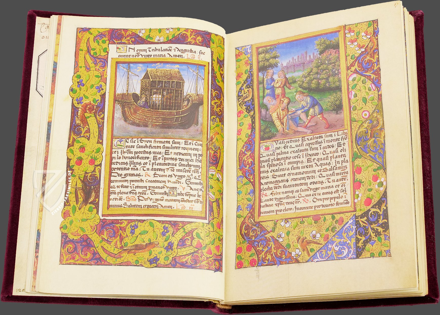 Die Handschrift im kleinen Format von 21 auf 14,7 cm ist durch ihren ausgefallenen Buchschmuck besonders reizvoll. Die ausgefeilte Bildkonzeption des Werkes ist recht ungewöhnlich für ein Stundenbuch. Die Seiten des Werkes sind mit prächtigen Blütenverzierungen geschmückt und die 90 Miniaturen zeigen Serien verschiedener Bibelmotive. Die verzierten Bordüren weisen neben Blütenschmuck Bilder von Vögeln, exotischen Tieren und fantastischen Ungeheuern auf. Teils sind sie von Sinnsprüchen durchzogen, die Themen der Gebetstexte und Miniaturen aufgreifen.