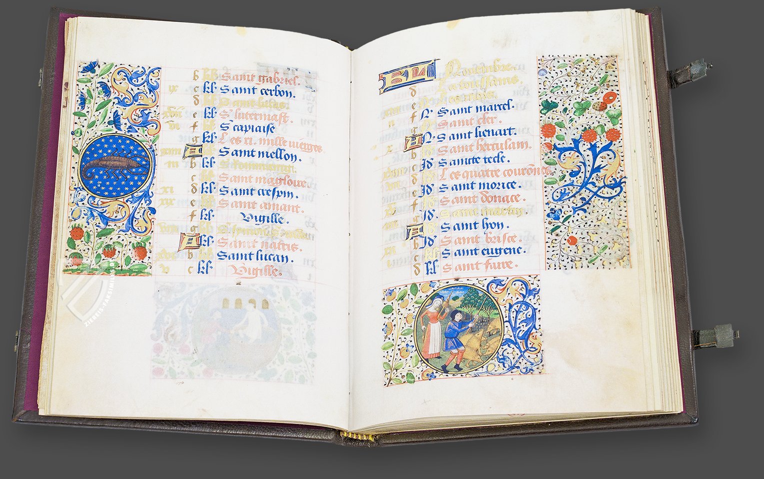 Das sogenannte Stundenbuch von Rouen ist ein wunderbares Paradebeispiel der französischen Buchkunst des 15. Jahrhunderts. Die Handschrift wurde um 1475 in Rouen in der renommierten Werkstatt des Meisters der Échevinage geschaffen und mit überbordendem Buchschmuck ausgestattet. 29 ganzseitige Miniaturen von höchster Kunstfertigkeit zeugen von der Marienfrömmigkeit des Auftraggebers oder der Auftraggeberin, der oder die eine wohlhabende Person von hohem Rang gewesen sein muss. Zugleich umfassen exquisite Bordürenstreifen aus stilisiertem floralem Ornament und naturalistischen Pflanzen fast alle Seiten der kostbaren Handschrift, wobei immer wieder kleine Früchte und Blüten, aber auch fantasievolle zoomorphe Figuren die Ranken beleben. Im schmuckvollen Kalendarium setzen perfekte Medaillons die Monatsarbeiten und Tierkreiszeichen kunstvoll in Szene. Die gesamte Handschrift erstrahlt dabei in kraftvollen Farben und leuchtendem Gold, das sich durch Text und Illumination zieht. Ein wahres Schmuckstück spätmittelalterlicher Buchmalerei!