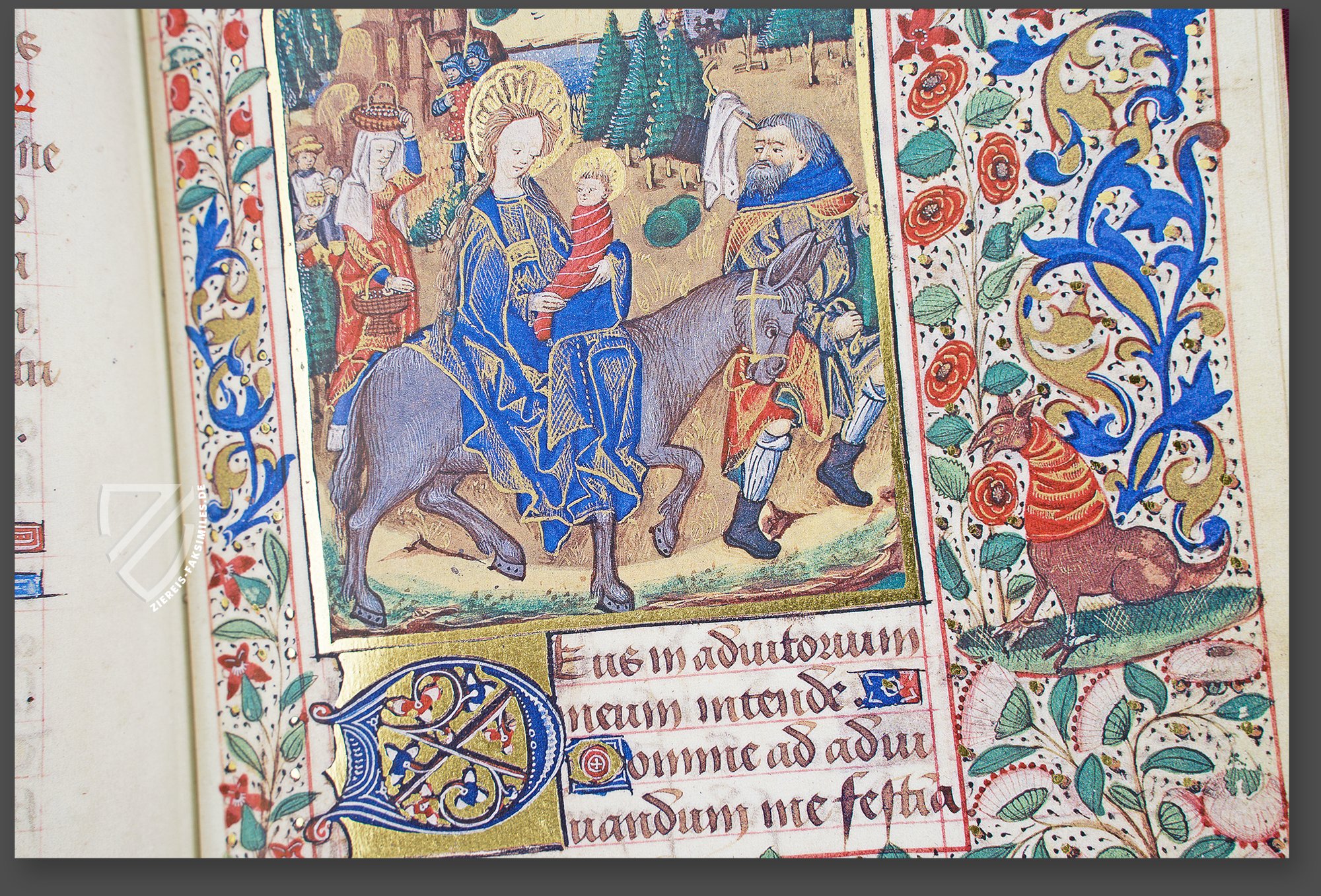 Diese prachtvolle Miniaturseite zeigt die Heilige Familie auf der Flucht vor dem Zorn des Königs Herodes, nachdem Josef in einem Traum vor ihm gewarnt worden war. "Da stand Josef auf und floh in der Nacht mit dem Kind und dessen Mutter nach Ägypten. Dort blieb er bis zum Tod des Herodes. Denn es sollte sich erfüllen, was der Herr durch den Propheten gesagt hat: Aus Ägypten habe ich meinen Sohn gerufen." (Mt 2, 14-15)