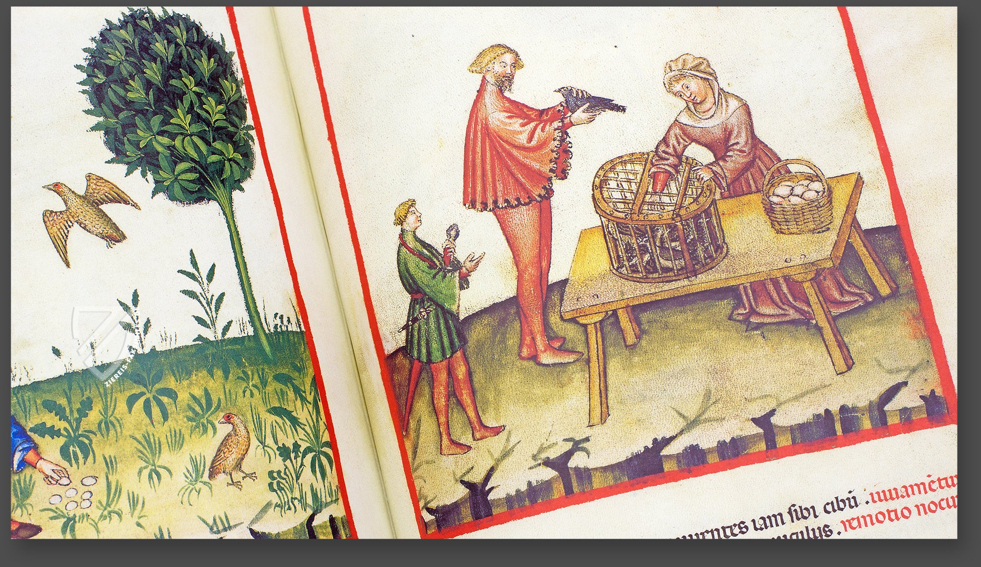 Die vorliegende Seite befasst sich mit der Aufzucht von jungen Täubchen zur Nahrungsgewinnung als Teil einer Reihe über jene Taubenarten, von denen die moderne Taube abstammt. Die Bildunterschrift lautet: "NATUR: heiß und trocken im zweiten Grad. BESSER, wenn bereits entwöhnt. NÜTZLICH bei Lähmungen und Schüttelfrost. SCHÄDLICH für das Gehirn und verursachen Schlaflosigkeit. Als GEGENMITTEL gegen Schädigung Essig und Koriander."