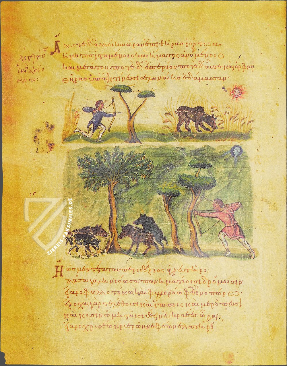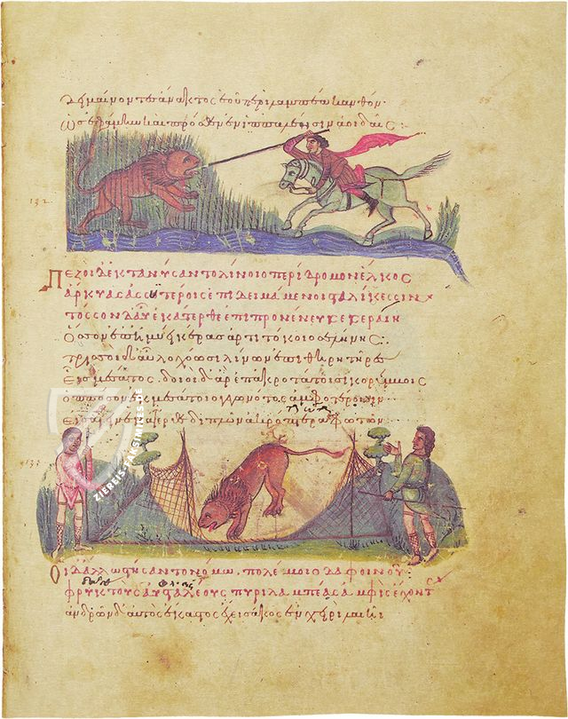 Der griechische Text dieser Seite, ordentlich in schwarzer und roter Tinte geschrieben, handelt von verschiedenen Methoden der Löwenjagd, von denen zwei durch in den Text integrierte Miniaturen dargestellt sind. Es ist ein wunderbares Beispiel byzantinischer Kunst in einer Zeit, in der klassische Themen und die antike Ästhetik wieder aufleben, einschließlich naturalistischerer menschlicher Figuren – im deutlichen Unterschied zum typisch ikonografischen byzantinischen Stil.