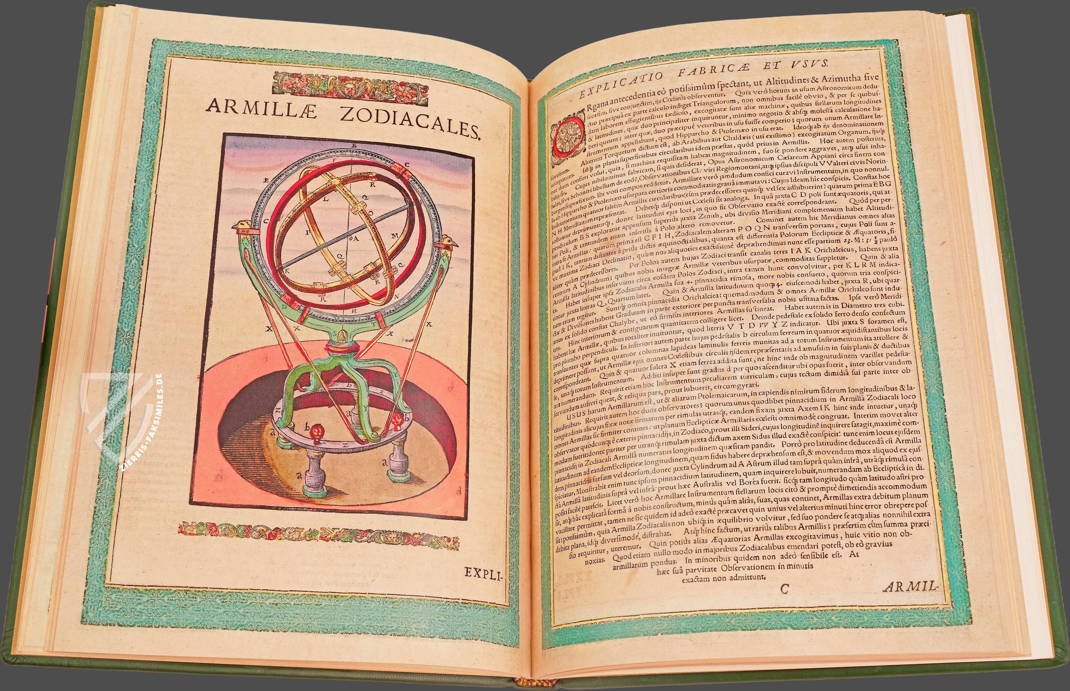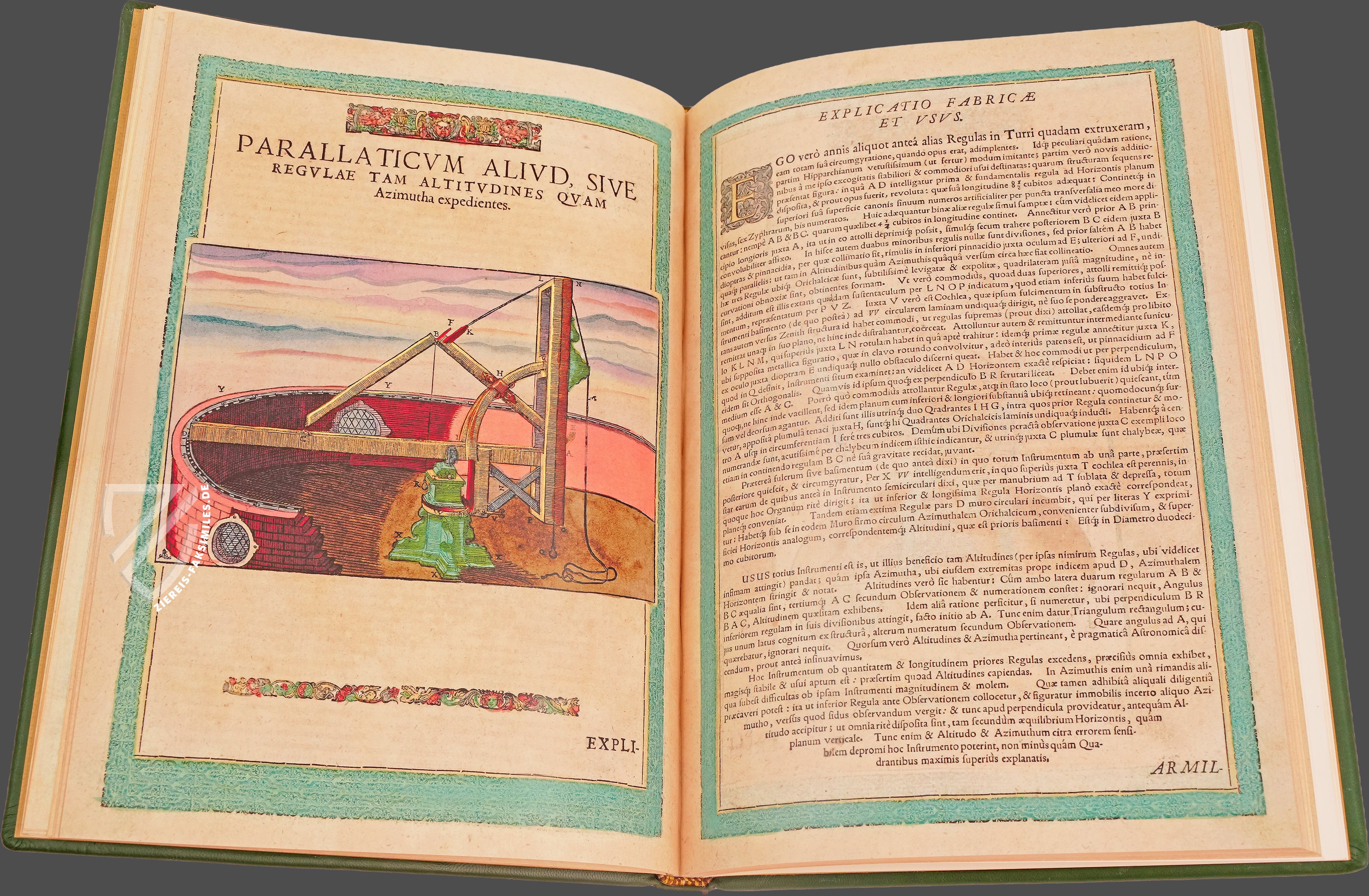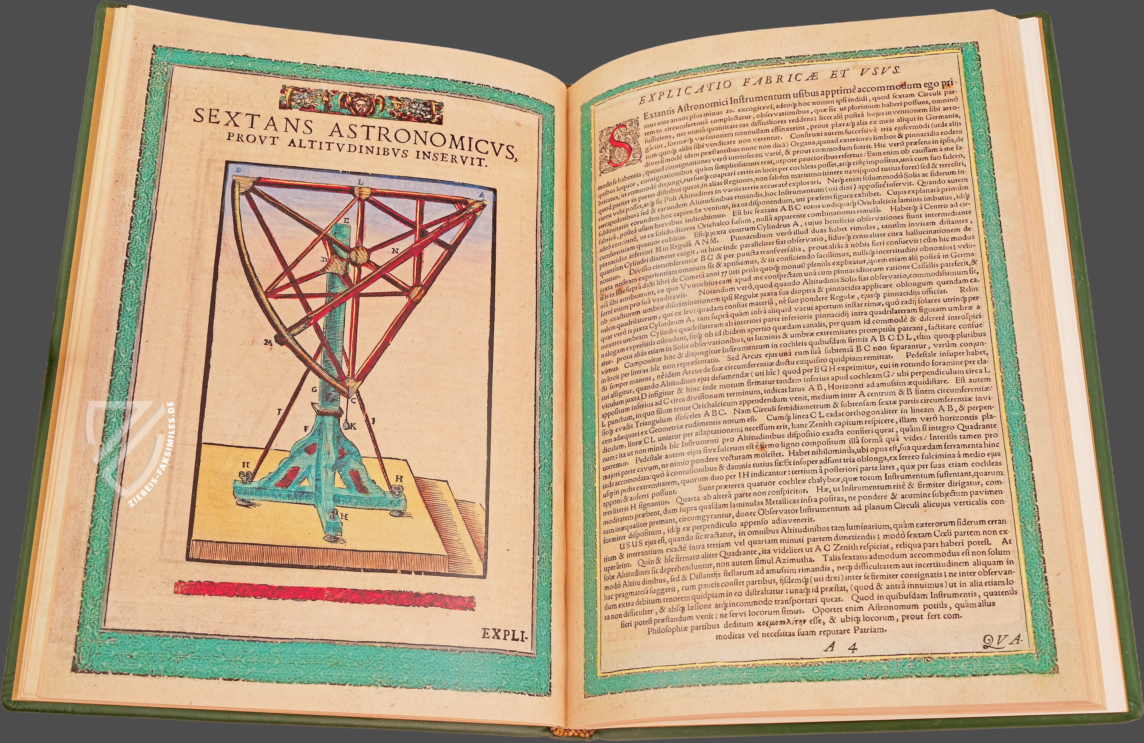 Tycho de Brahe (1546–1601) ging als Astronom vor allem wegen seiner unglaublich umfangreichen und präzisen Himmelsbeobachtungen in die Geschichte ein, die er noch ganz ohne Linse – also ohne Fernrohr oder Teleskop – durchführte und auf deren Grundlage es Johannes Kepler (1571–1630) später möglich war, seine bahnbrechenden Erkenntnisse zur Planetenbewegung zu erlangen. Mit seiner Methodik des wiederholten und immer exakteren Messens und Nachprüfens, die er nur mit einer ganzen Horde an Mitarbeiterinnen realisieren konnte, hatte er zudem einen entscheidenden Einfluss auf das bis heute gültige Wissenschaftsideal. All das wäre ohne die von ihm entwickelten Instrumente nicht möglich gewesen. Seine Konstruktionen hielt er in einem aufwendig illustrierten Katalog mit ausführlichen Beschreibungen fest: *Tycho de Brahe: Astronomiae Instauratae Mechanica. Mit seinen akkuraten und kunstfertigen kolorierten, ganzseitigen Holzschnitten und Kupferstichen ist es ohne Frage eines der bemerkenswertesten wissenschaftlichen Bücher der Renaissance. Die Sächsische Landesbibliothek bewahrt ein Exemplar der brillanten Erstausgabe, die 1598 in Wandsbek an Brahes eigener Druckerpresse gedruckt wurde.
