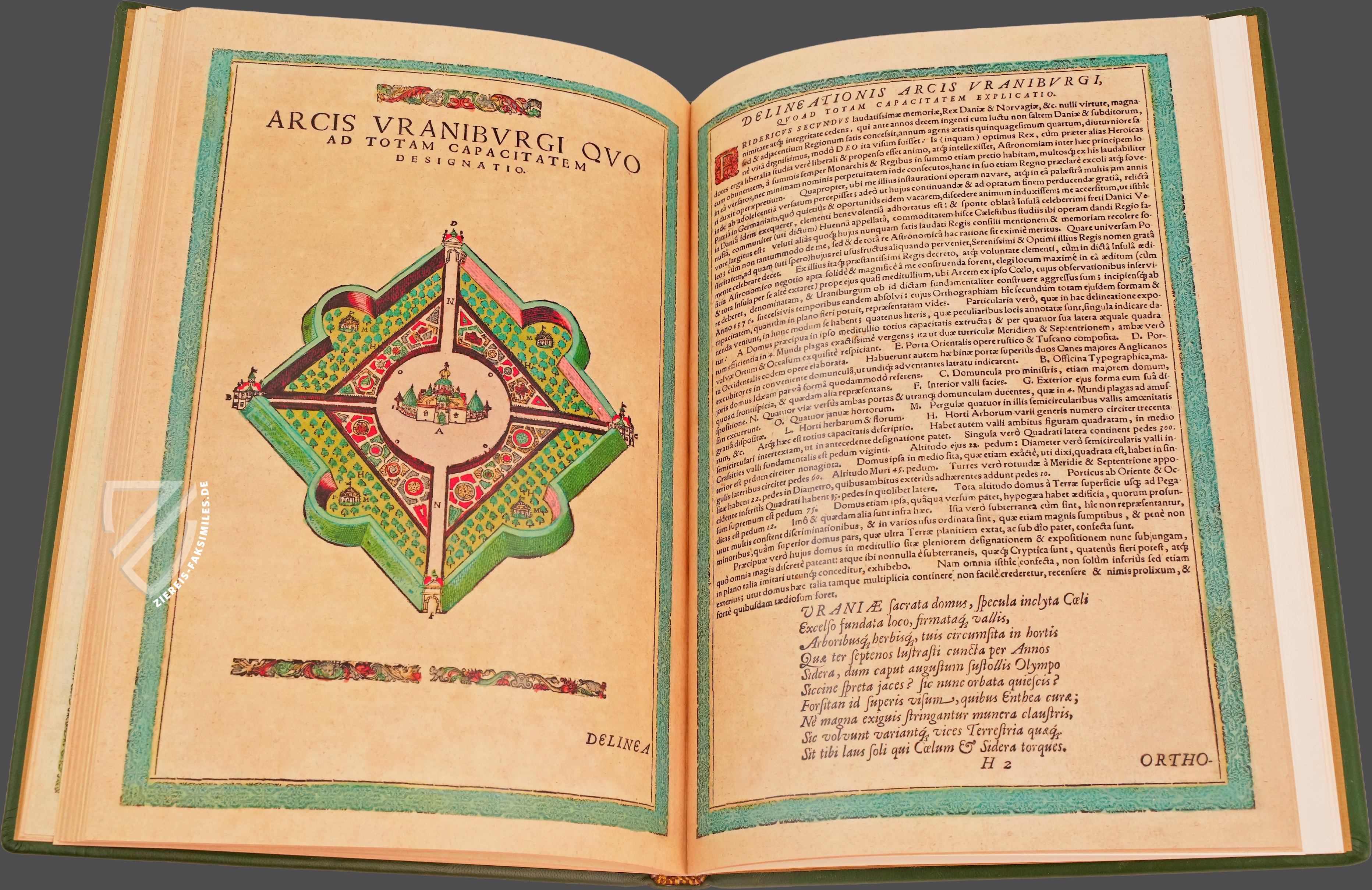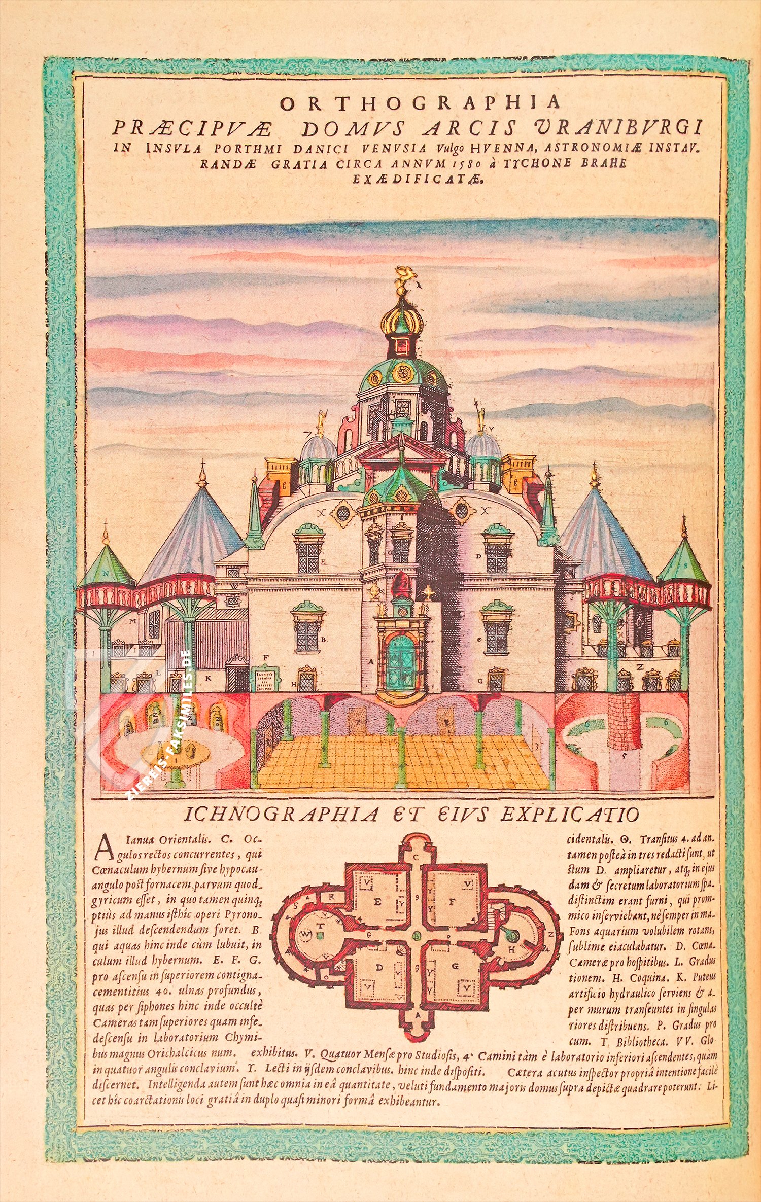 Friedrich II. förderte nicht nur Tycho Brahes astronomische Forschung als solche, sondern übernahm beispielsweise auch die Kosten für den Bau seines legendären Observatoriums auf der Insel Ven. Das beeindruckende kleine Schloss, das hier im Querschnitt und Grundriss zu sehen ist, wurde unter der Mitwirkung führender Baumeister und Bildhauer zwischen 1576 und 1580 errichtet und der Muse der Astronomie, Urania, gewidmet.