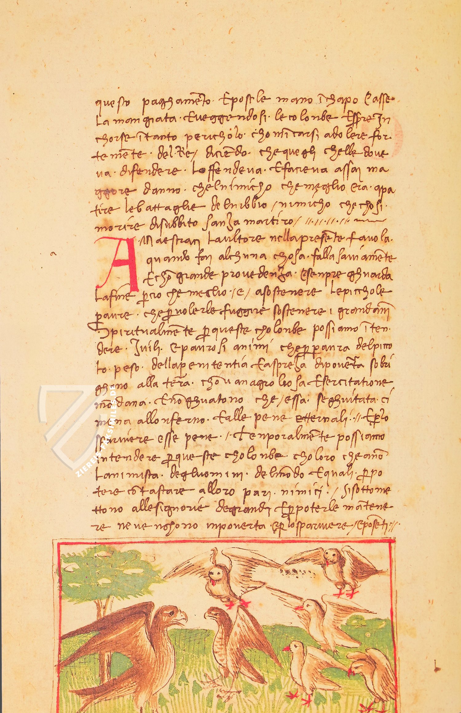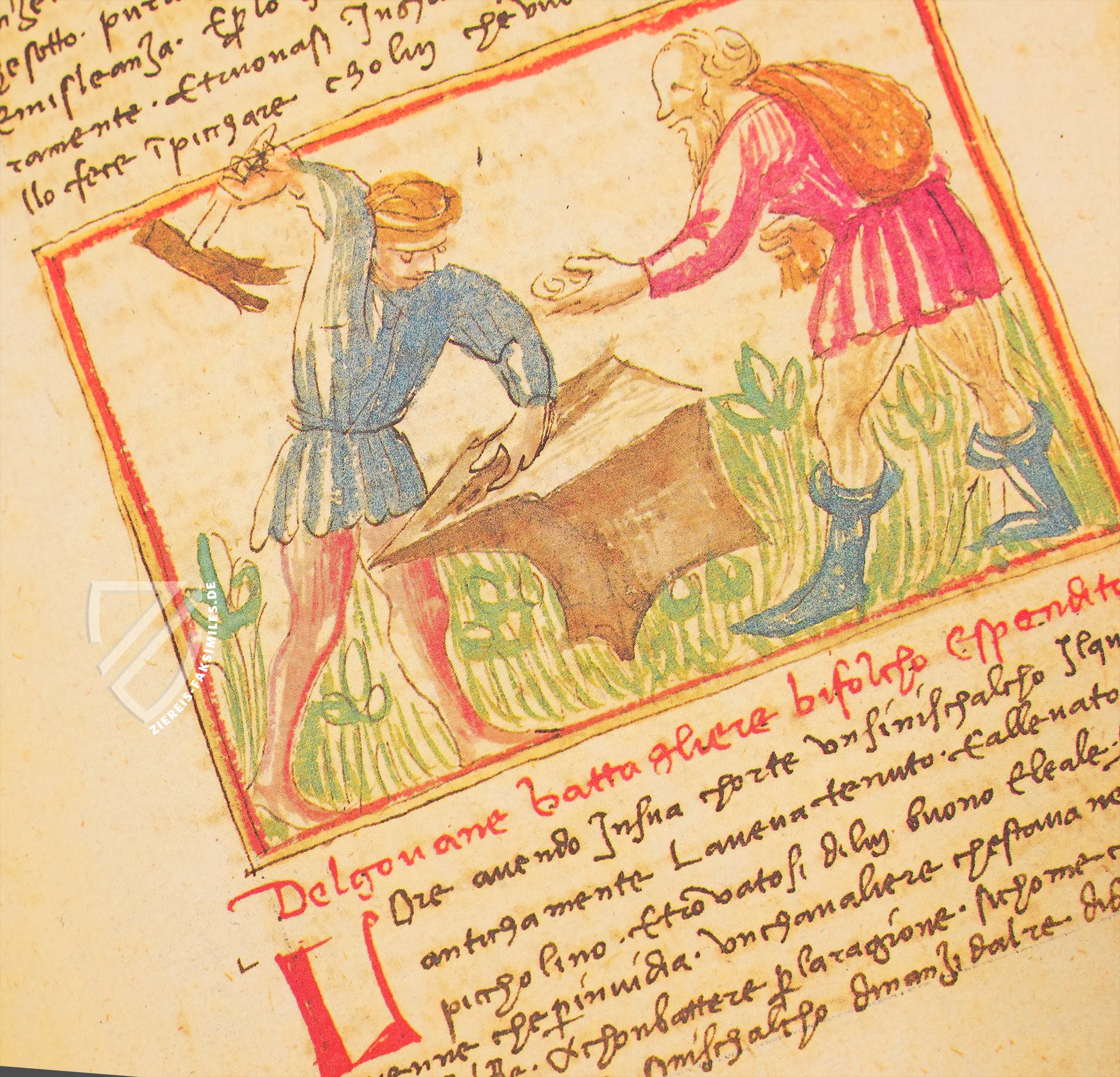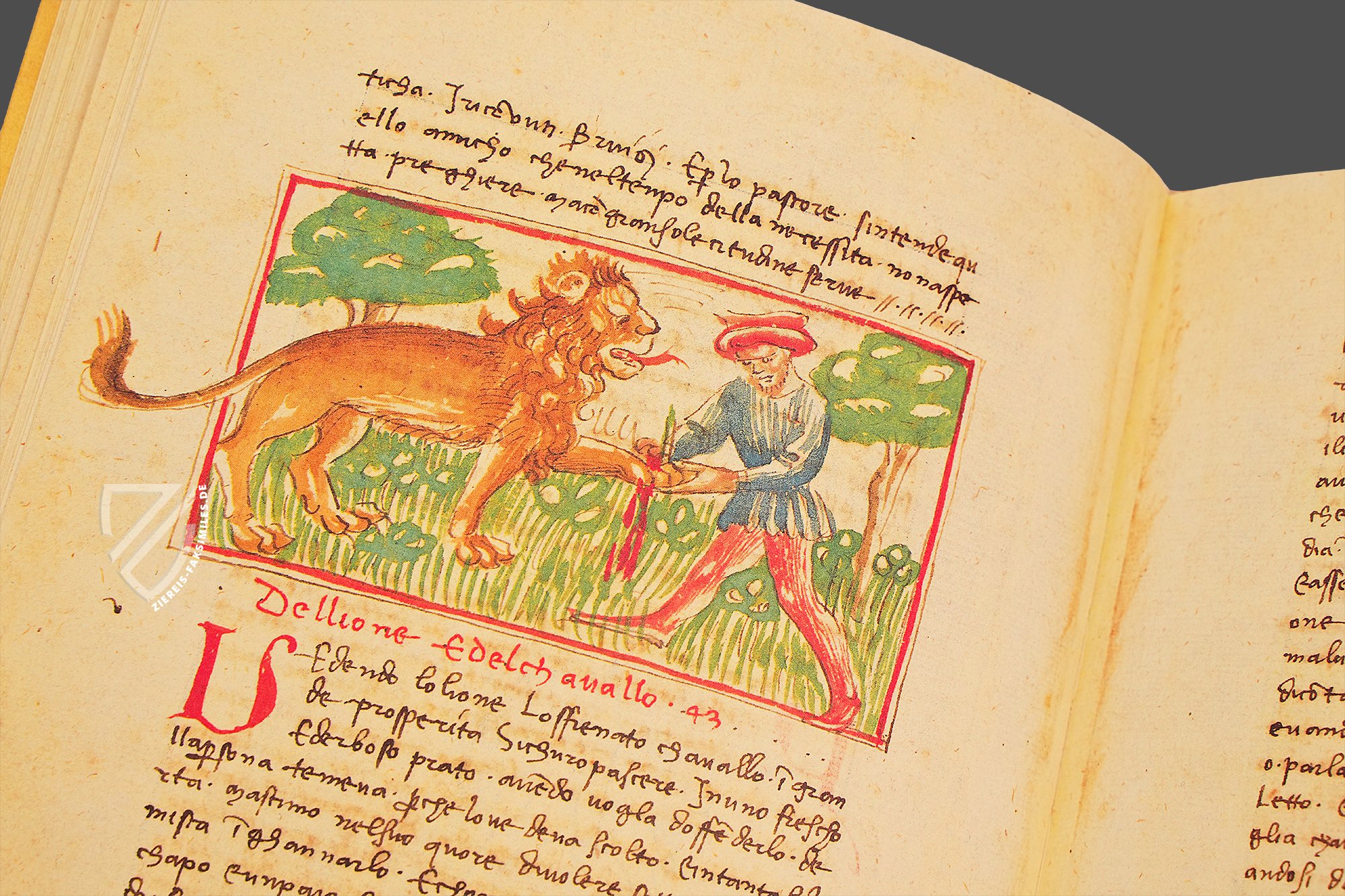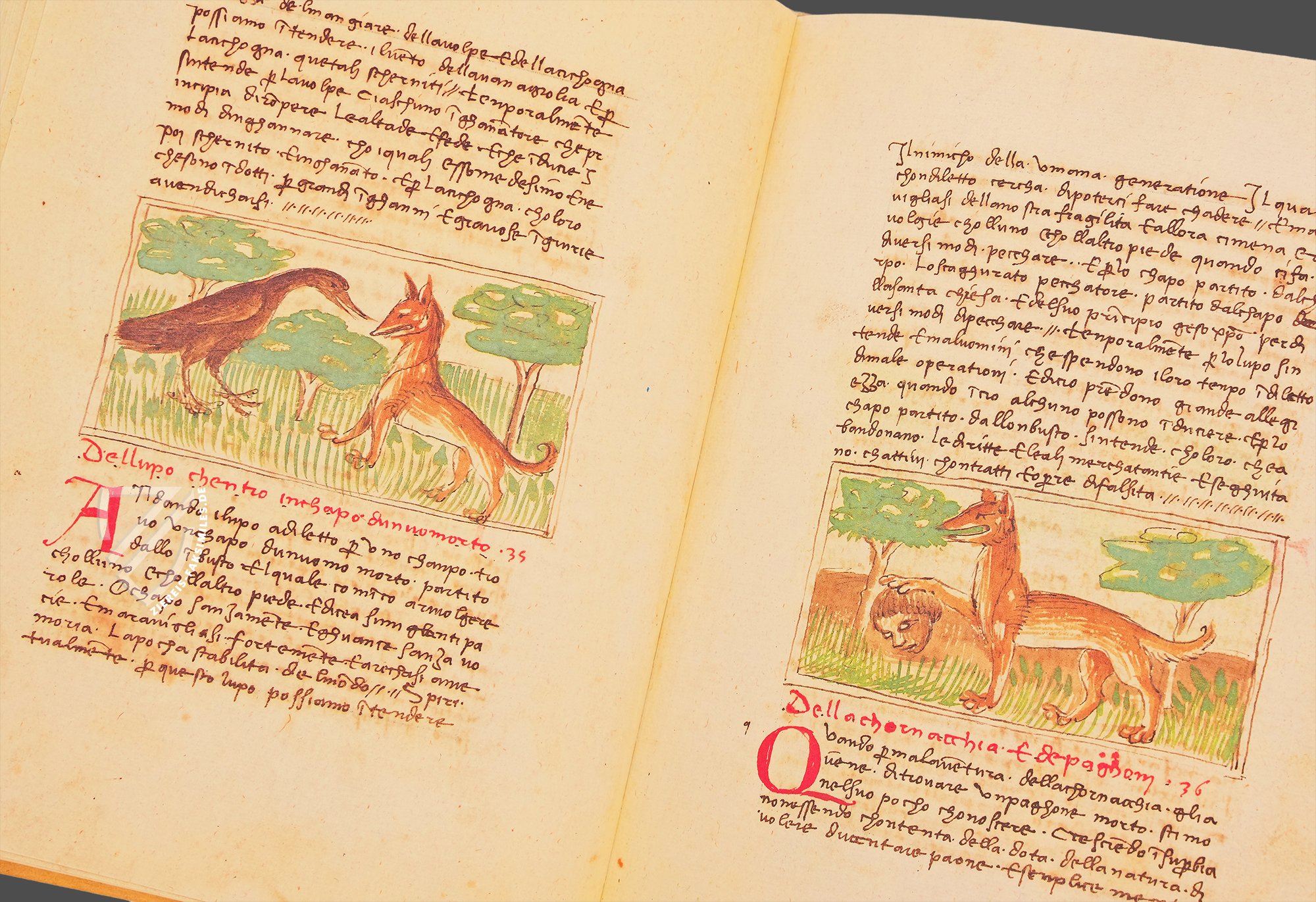 Die Moral der Geschichte: Wer sich über die eigene Natur hinwegsetzen will, kommt zu Schaden und kann es vielleicht sogar nicht einmal mehr bereuen. Das wurde im christlichen Mittelalter und darüber hinaus nicht nur auf körperliche Gegebenheiten bezogen, sondern auch auf gesellschaftliche Kategorien wie Klasse und Geschlecht. Die in Braun- und Grüntönen gehaltene Miniatur illustriert die in toskanischem Italienisch verfasste Adaption der antiken Fabel, die von einer roten D-Lombarde am Anfang der Seite eingeleitet wird.