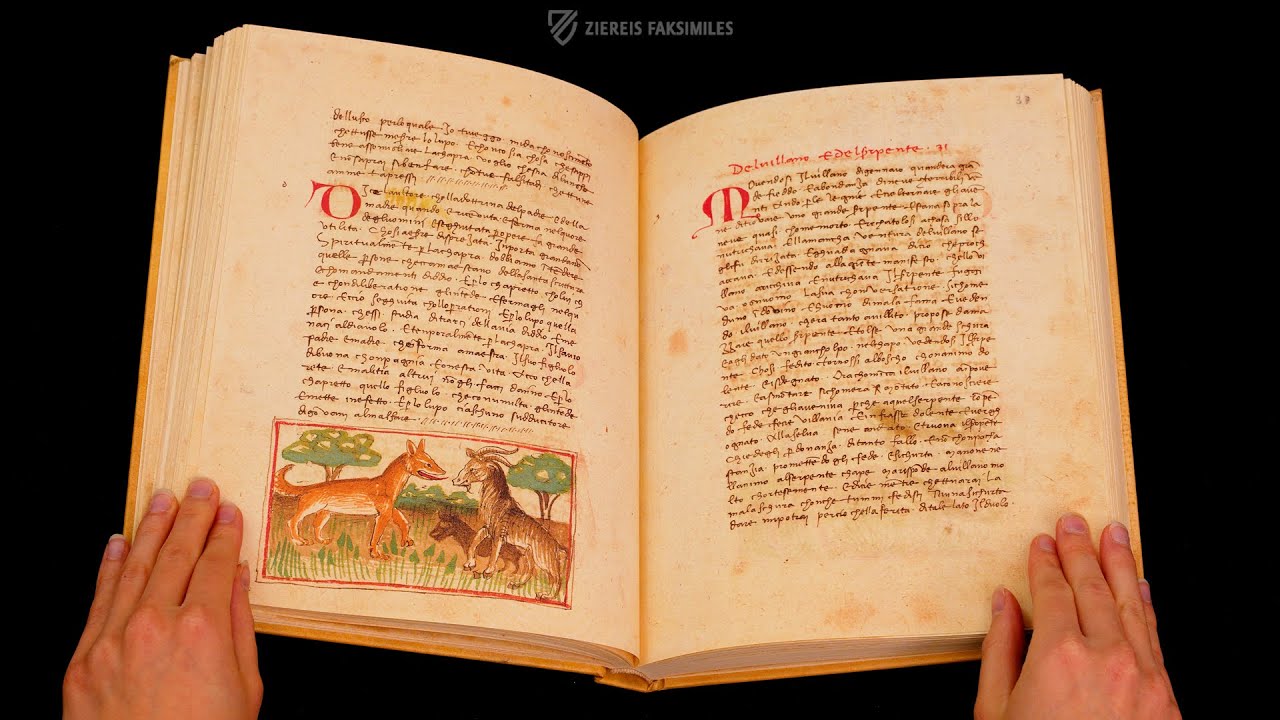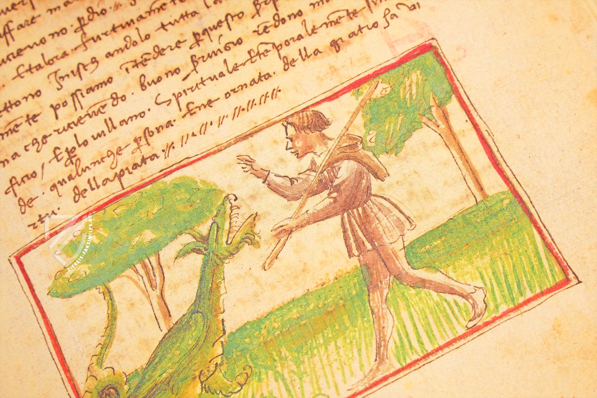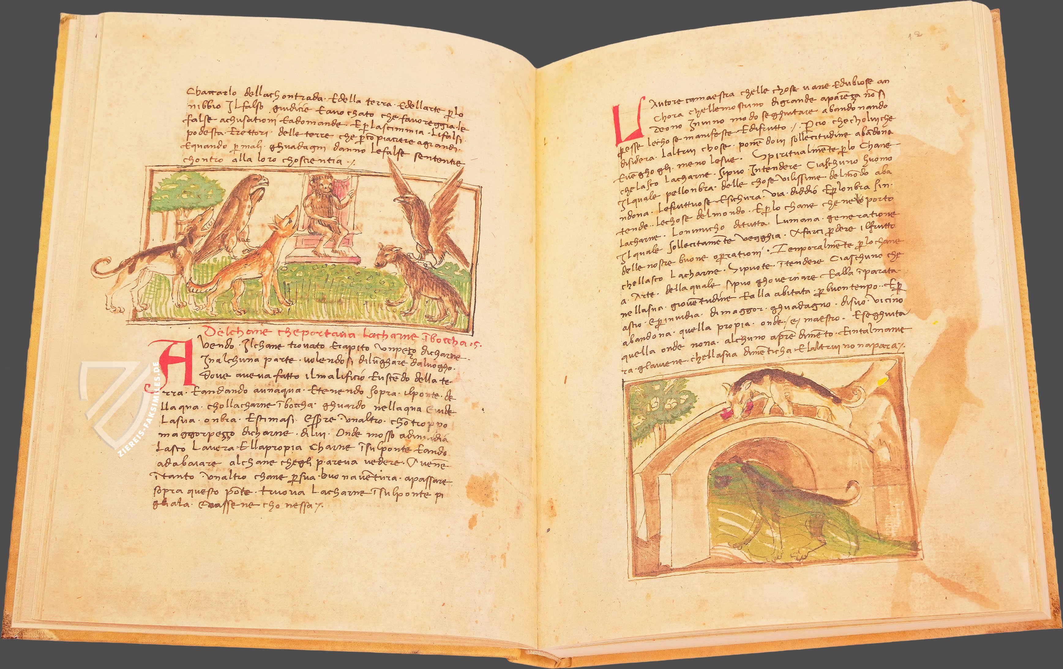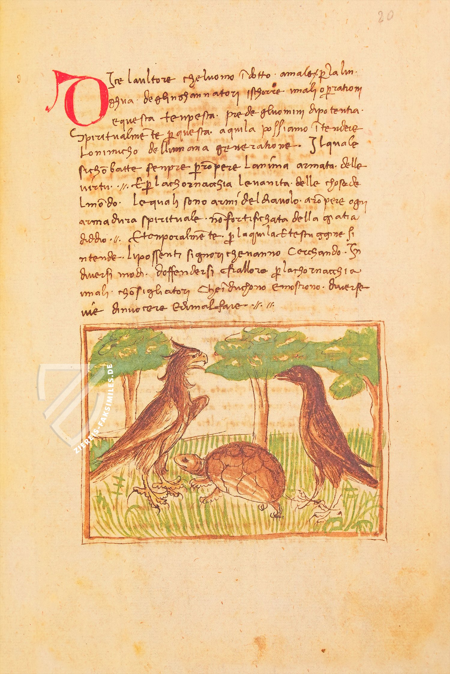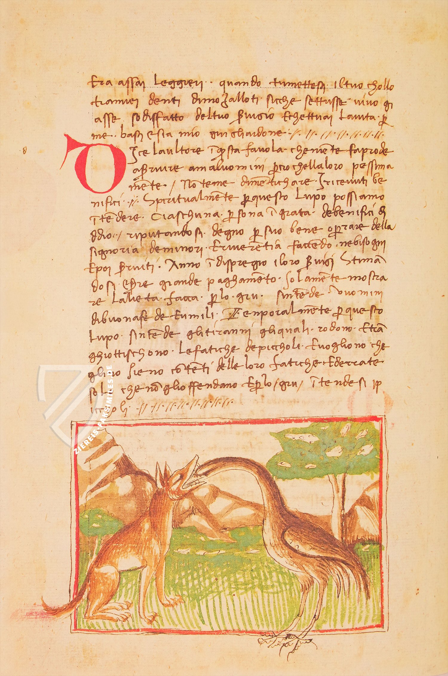 Die Moral der Geschichte: Wer sich über die eigene Natur hinwegsetzen will, kommt zu Schaden und kann es vielleicht sogar nicht einmal mehr bereuen. Das wurde im christlichen Mittelalter und darüber hinaus nicht nur auf körperliche Gegebenheiten bezogen, sondern auch auf gesellschaftliche Kategorien wie Klasse und Geschlecht. Die in Braun- und Grüntönen gehaltene Miniatur illustriert die in toskanischem Italienisch verfasste Adaption der antiken Fabel, die von einer roten D-Lombarde am Anfang der Seite eingeleitet wird.