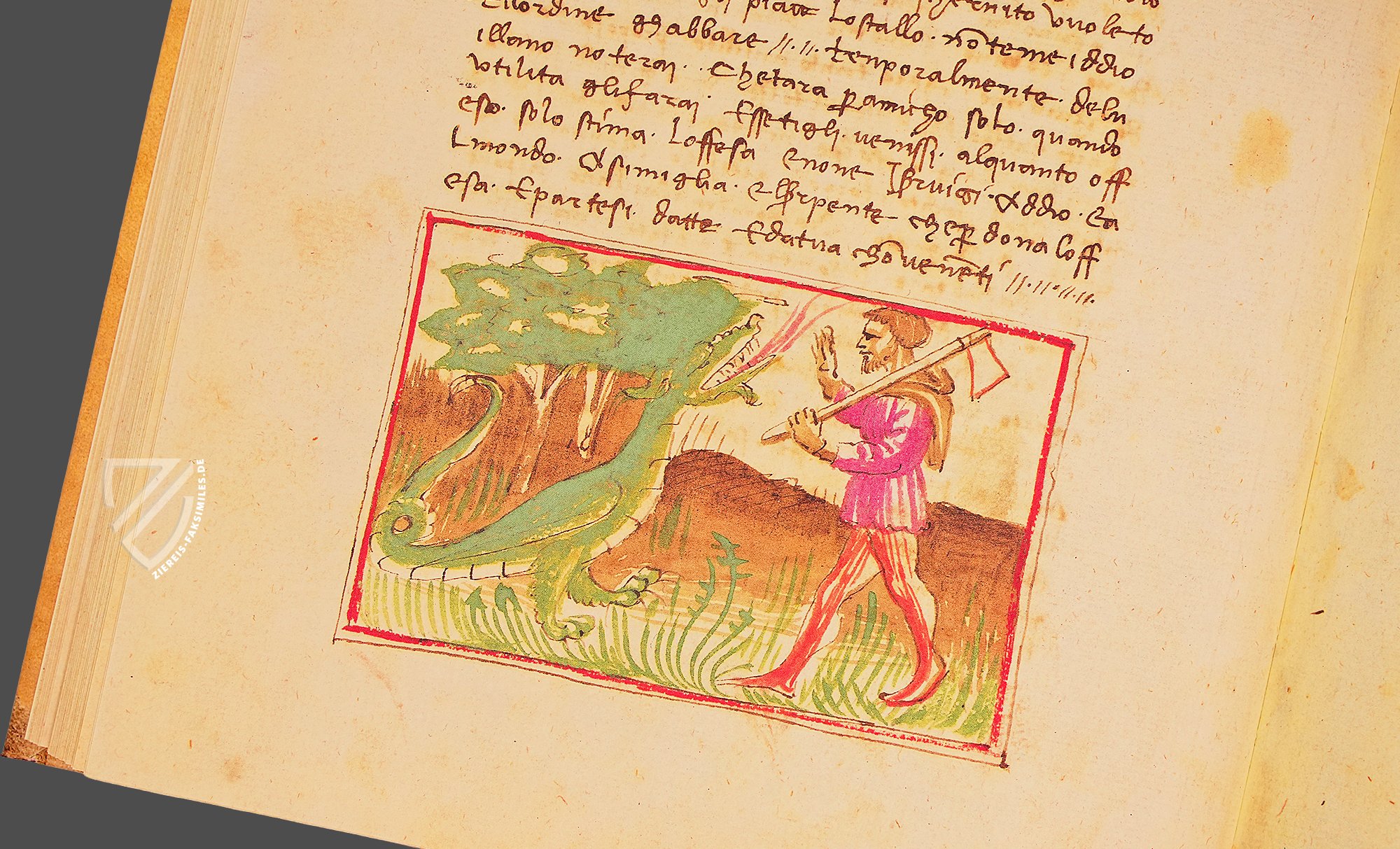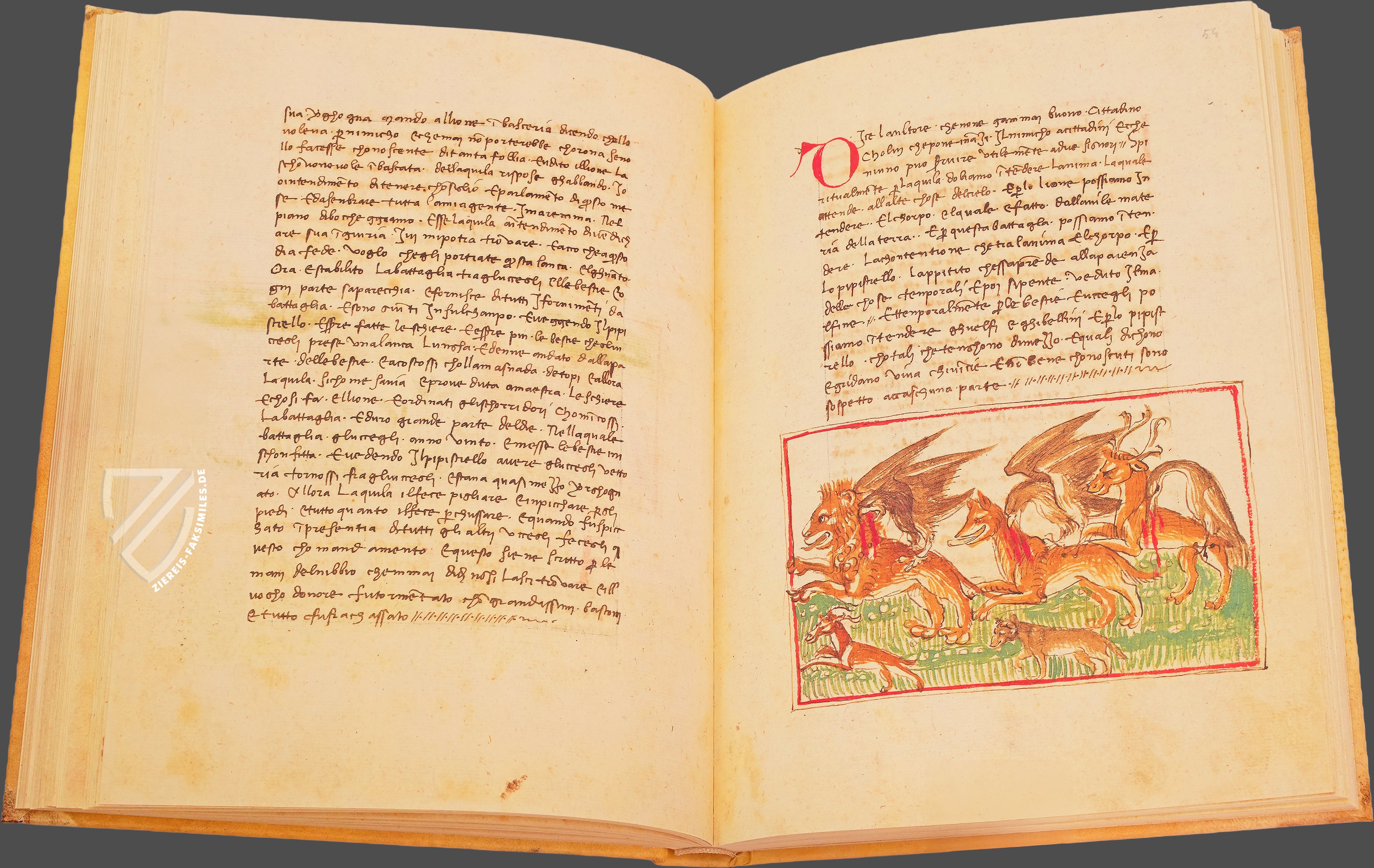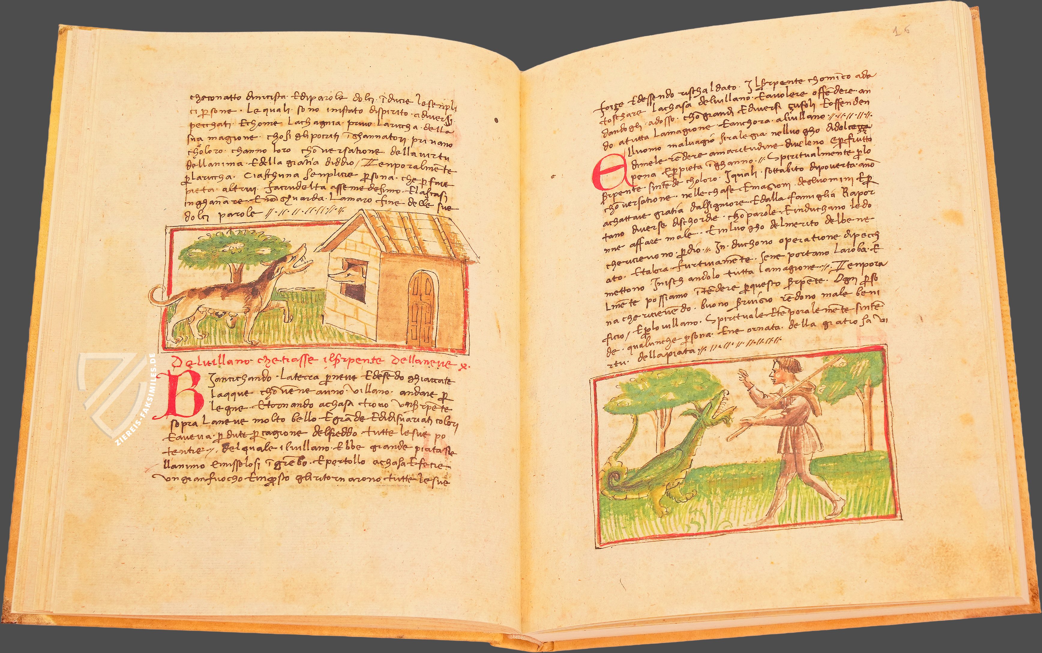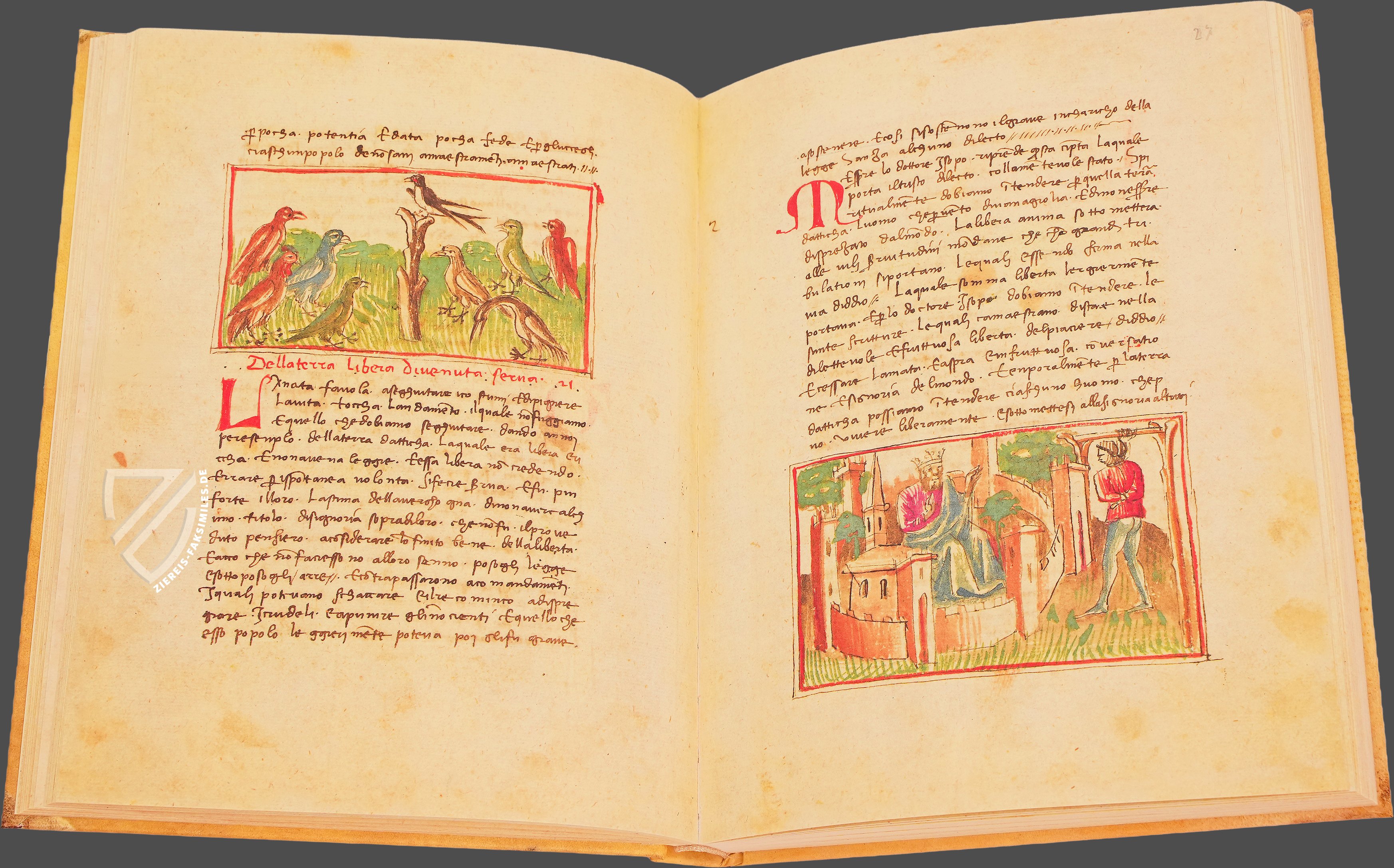 Die Moral der Geschichte: Wer sich über die eigene Natur hinwegsetzen will, kommt zu Schaden und kann es vielleicht sogar nicht einmal mehr bereuen. Das wurde im christlichen Mittelalter und darüber hinaus nicht nur auf körperliche Gegebenheiten bezogen, sondern auch auf gesellschaftliche Kategorien wie Klasse und Geschlecht. Die in Braun- und Grüntönen gehaltene Miniatur illustriert die in toskanischem Italienisch verfasste Adaption der antiken Fabel, die von einer roten D-Lombarde am Anfang der Seite eingeleitet wird.