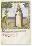 Dieses groteske Mischwesen eines Drachen mit gefiederten Flügeln und einem Männerkopf soll das katastrophale Papsttum von Urban VI. verkörpern. Der Künstler verwendet verschiedene Symbole, um seine Bosheit von Urban auszudrücken: einen gegabelten Bart, die länglichen Augen eines Esels, eine Schlange, einen Skorpion und einen Dolch, der im Boden steckt. Gerade dadurch wird diese Miniatur schauderlich und wunderschön zugleich.