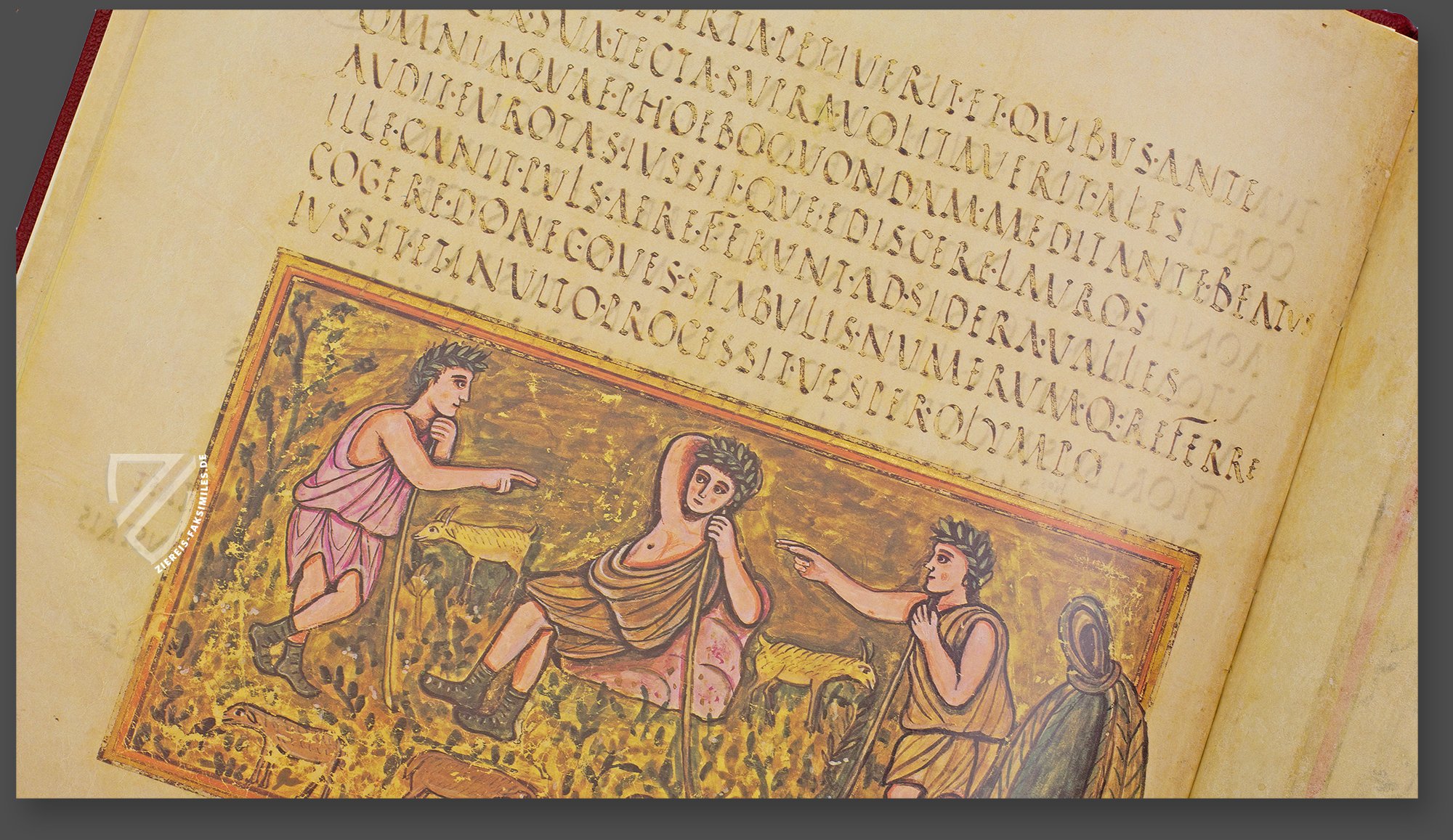 Diese kunstfertige Miniatur zweier Hirten mit ihren Ziegenherden leitet Vergils Eclogae ein, auch bekannt als Bucolica. Während Tityrus auf einer Flöte spielt, tritt Meliboeus, der sein Land verloren hat und einer unsicheren Zukunft entgegenblickt, an ihn heran. Darauf berichtet Tityrus von seiner Reise nach Rom und seinem Treffen mit dem „Gott“ (wahrscheinlich Octavian), der ihm sein Land ließ. Als die Nacht hereinbricht, bietet Tityrus, der als Alter Ego Vergils gedeutet wird, Meliboeus sein Haus zur Unterkunft an.