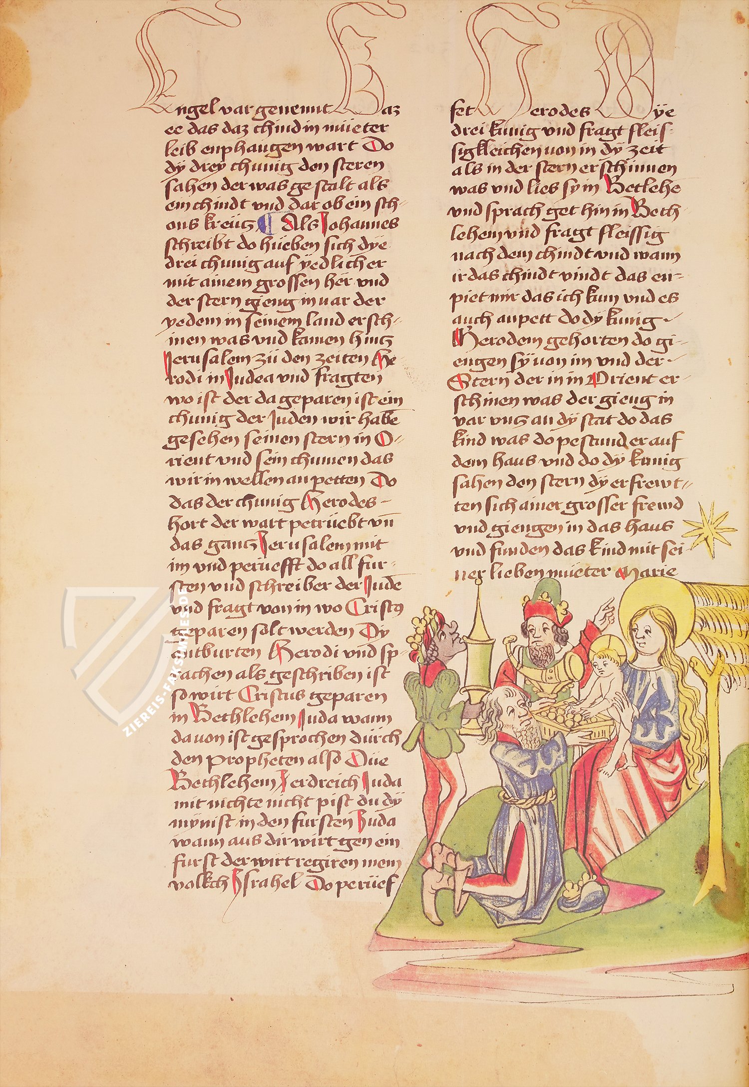 Die Miniaturen werden an der entsprechenden Stelle in den zweispaltigen deutschen Text eingefĂŒgt. Links bieten die BrĂŒder ihre Brandopfer am Altar dar: Abel der Hirte hat das edelste Lamm seiner Herde ausgesucht, wĂ€hrend Kain nur einen Scheffel Getreide opfern möchte. Die folgende Szene zeigt Abel schon am Boden, sein Kopf blutet bereits aus einer Wunde, als Kain die Hacke hebt, um noch einmal zuzuschlagen.