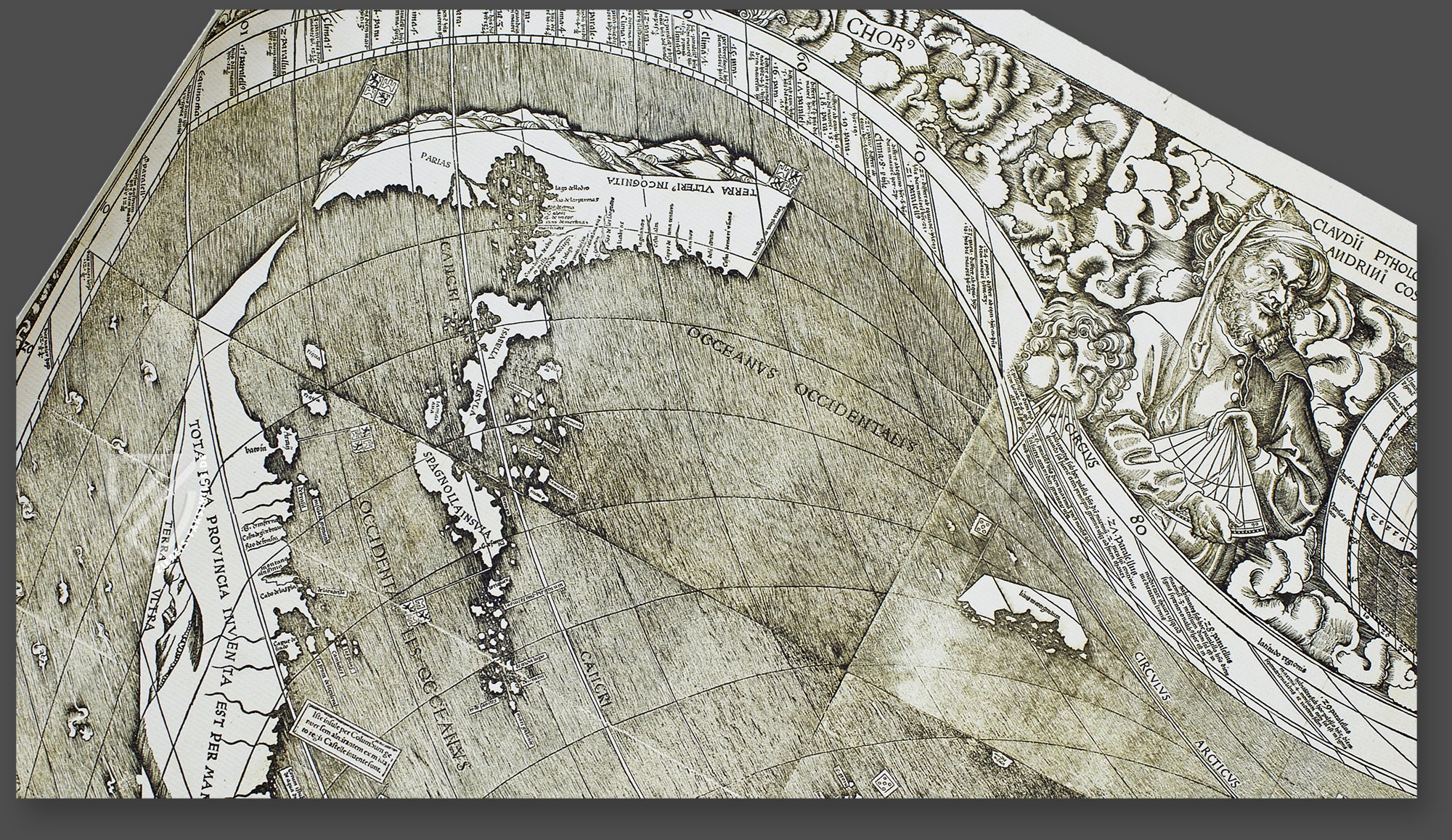 Martin Waldseemüller (ca. 1470-1520) war ein deutscher Kartograph und humanistischer Gelehrter, der die so genannte zweite Kegelprojektion des Ptolemäus modifizierte und sie um Amerika und die höheren Breitengrade erweiterte. Gekrümmte Meridiane helfen bei der Darstellung der gesamten Erdoberfläche. Oben in der Mitte der Seite ist eine weitere, miniaturisierte Weltkarte eingefügt, die gewissermaßen eine alternative Sicht auf die Welt darstellt.