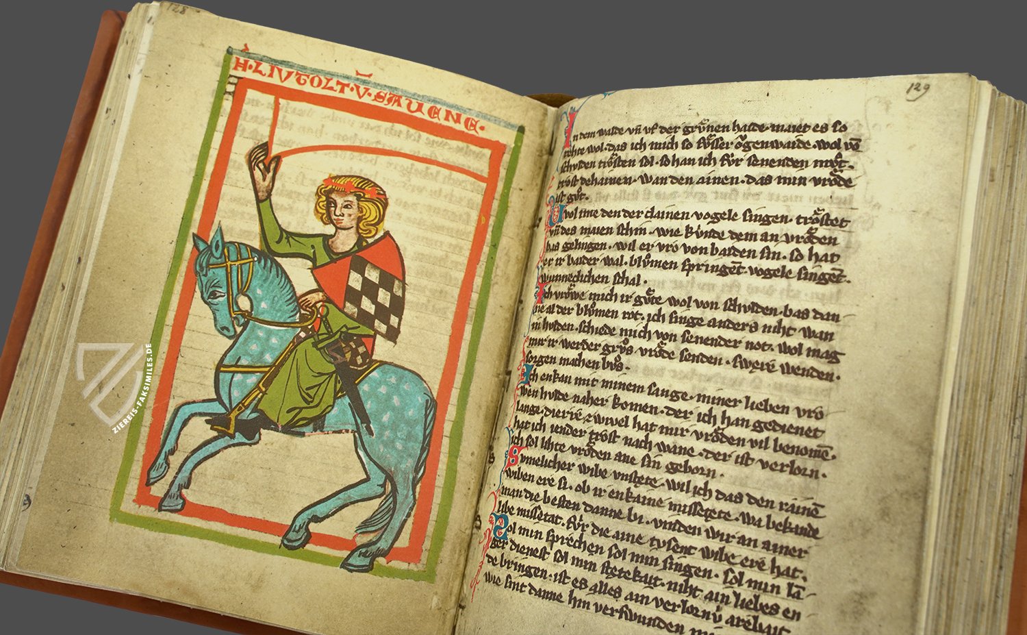 Dieses feine Exemplar des Minnesangs, der deutschen Version der mittelalterlichen Troubadourtradition, soll Anfang des 14. Jahrhunderts in der Region Konstanz entstanden sein. Es ist eines der wichtigsten Artefakte dieser Tradition und enthält die Werke von 31 mittelhochdeutschen Dichtern. Zu diesen meist aristokratischen Dichterinnen und Dichtern gehört sogar Kaiser Heinrich IV., dessen Kompositionen am Anfang des Codex stehen.