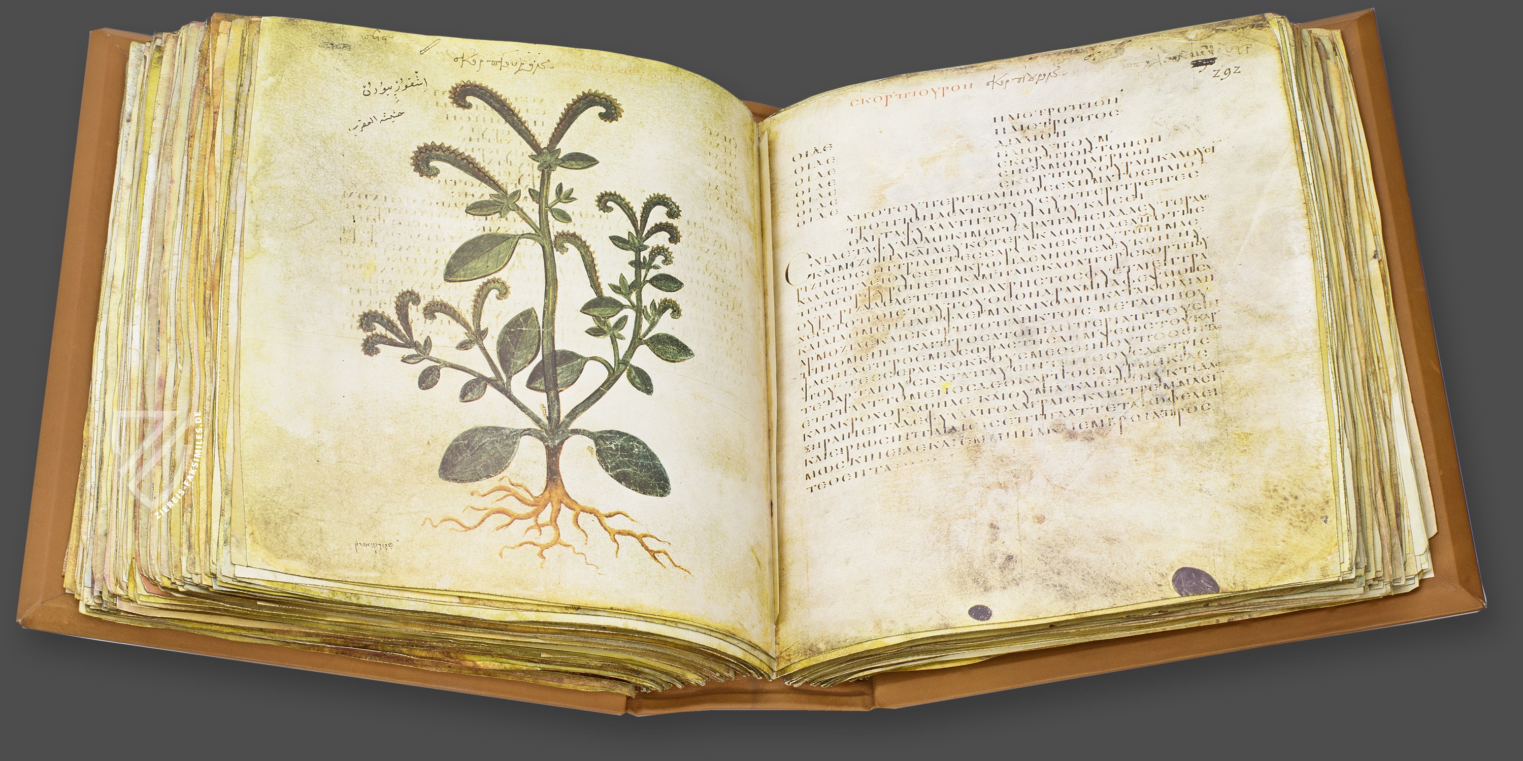Eine der wertvollsten spĂ€tantiken illuminierten Handschriften ist ein zu Beginn des 6. Jahrhunderts in Konstantinopel entstandenes Herbarium, das nach seinem heutigen Aufbewahrungsort Wiener Dioskurides genannt wird. Der Codex beschreibt zahlreiche heilkrĂ€ftige KrĂ€uter sowie giftige Tiere und Vögel. Ihm sind zudem Abschriften von vier klassischen wissenschaftlichen Werken beigefĂŒgt. Er ist mit 392 ganzseitigen Miniaturen und 87 in den Text integrierten kleineren Bildern illustriert, von denen die meisten den Pflanzen, 66 den giftigen Tieren und 47 verschiedenen Vogelarten gewidmet sind. Die hervorragenden Miniaturen orientieren sich an spĂ€thellenistisch-römischen Vorlagen und sind nicht zuletzt deshalb von unschĂ€tzbarem Wert, weil die antiken Originale verloren gegangen sind. Vor diesem Hintergrund ist es nicht verwunderlich, dass das Manuskript 1998 zum UNESCO-Weltdokumentenerbe erklĂ€rt wurde.