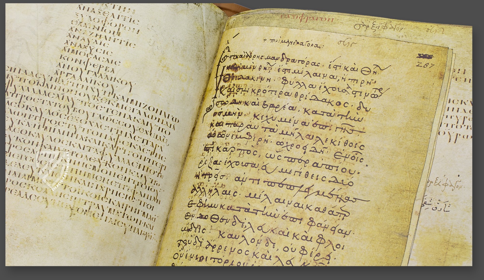 Das Manuskript besteht gröĂtenteils aus seiner Kopie des Dioskuridenherbariums (De materia medica) des Arztes und Botanikers Pedanius Dioskurides (1. Jahrhundert n. Chr.), das in diesem Codex, im Gegensatz zur Ordnung nach Sachgebieten im griechischen Original, in alphabetischer Reihenfolge angelegt ist. Die Beschreibungen von 383 Arzneipflanzen sind im Schrifttyp einer archaisierenden, griechischen Majuskel, der sogenannten Bibelmajuskel, ausgefĂŒhrt. SpĂ€tere Transkriptionen sind in Minuskelschrift hinzugefĂŒgt, da die alte Majuskelschrift wohl zunehmend auĂer Gebrauch geraten und damit schwerer zu lesen war. In anspruchsvoller didaktischer Herangehensweise wird der Beschreibungstext von bildlichen Darstellungen der entsprechenden Heilpflanzen begleitet. Die meisten dieser Illustrationen bedecken eine ganze Seite und sind mit deckenden Farben ausgefĂŒhrt. Zusammen mit den 66 Illustrationen giftiger Tiere und 47 Vogelbildern, die in den beigefĂŒgten Schriften folgen, handelt es sich dabei um herausragende Kopien spĂ€thellenistischer Vorlagen, die von unschĂ€tzbarem Wert sind und das nicht nur, weil die antiken Originale verloren sind. Das Herbarium des Dioskurides nimmt mit 375 von insgesamt 485 BlĂ€ttern den Hauptteil des Buches ein, auf das mehrere AnhĂ€nge folgen. Diesen beigefĂŒgten Schriften ist zunĂ€chst ein anonymes Lehrgedicht ĂŒber die KrĂ€fte göttlich geweihter Pflanzen (Carmen de viribus herbarum) vorangestellt. Danach folgen vier Paraphrasen zu klassischen, naturwissenschaftlichen Werken: die Paraphrase des Euteknios zu den Theriaka des Nikandros von Kolophon, die Illustrationen von Pflanzen und wilden Tieren enthĂ€lt (Schlangen, Skorpione, Spinnen); eine weitere Paraphrase des Euteknios zu den Alexipharmaka desselben Autors, des Nikandros von Kolophon. Es folgt eine anonyme Paraphrase zu der Halieutika des Oppianos und zuletzt eine weitere anonyme Paraphrase zu der Ornithiaka des Dionysos von Philadelphia, die unzĂ€hlige Vogeldarstellungen enthĂ€lt, die fĂŒr die Geschichte der zoologischen Illustration von Bedeutung sind. Die letzten Seiten der Handschrift enthalten ein Fragment eines MenĂ€on, eines liturgischen Buches der orthodoxen Kirchen aus dem 11. Jahrhundert, das u. a. Heiligenviten enthĂ€lt und als ganzes Buch von deutlich gröĂerem Umfang ist als die hier angehĂ€ngten Textteile.