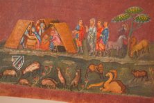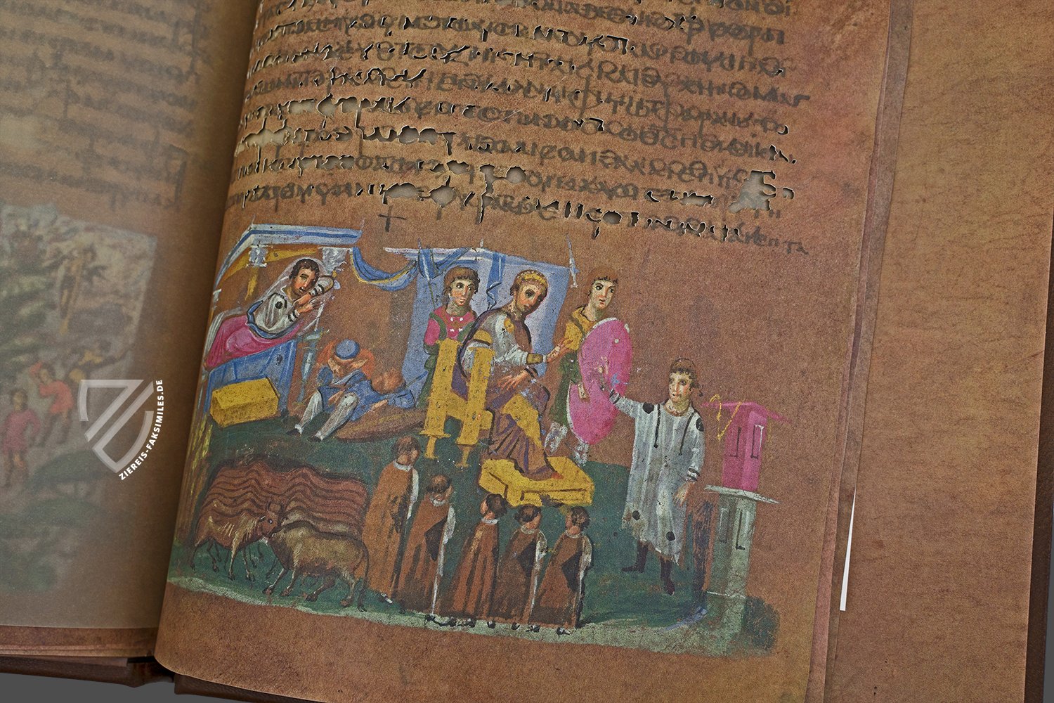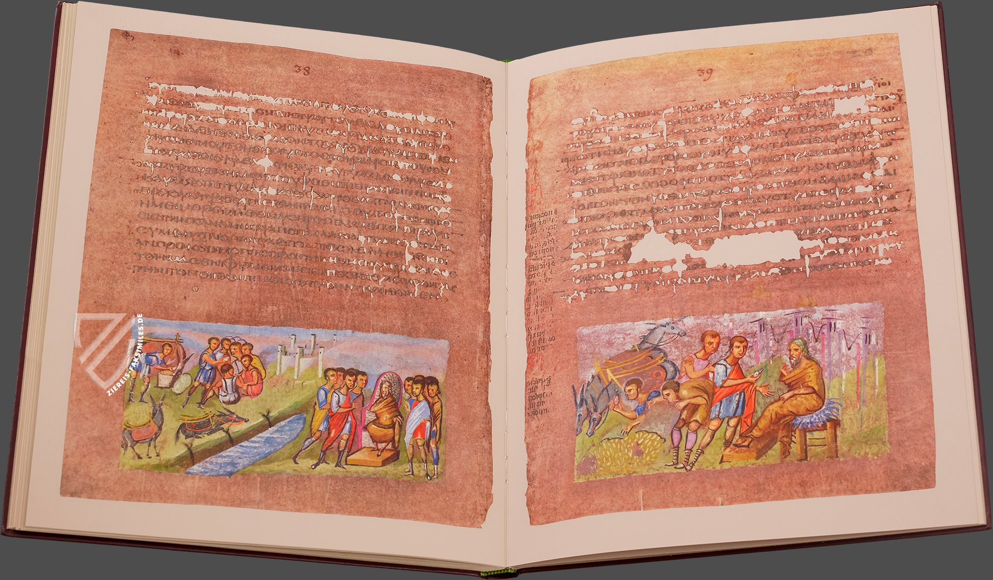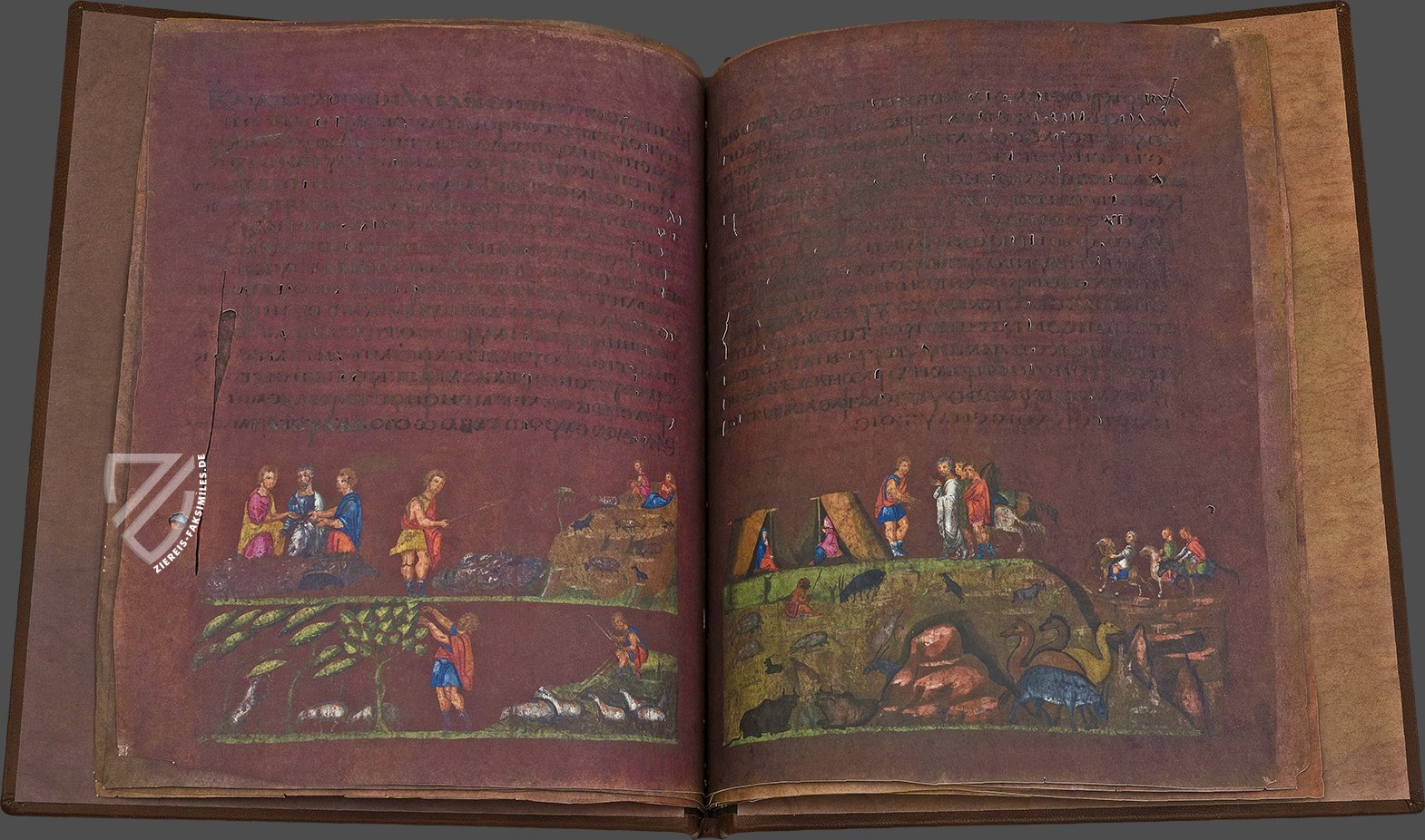 Sie schufen 48 leuchtende Miniaturen, die den Text der Genesis illustrieren. Vom SĂŒndenfall ĂŒber die Vertreibung aus dem Paradies behandeln diese Darstellungen die biblischen Geschichten zu Noah, Abraham, Lot und weiteren Figuren bis hin zu Joseph. Die Miniaturen, jeweils unter dem Text, sind zum Teil sogar in zwei Registern ĂŒbereinander angeordnet und meist ohne Rahmen direkt in die Seite gesetzt. Sie zeigen wunderschöne Darstellungen menschlicher Figuren, aber auch von Tieren (etwa bei der Szene zur Arche Noah), von Landschaft und Architektur. Dabei wird der gelungene Versuch gröĂtmöglicher NaturnĂ€he erkennbar. Die Miniaturen gelten als wahre Meisterwerke antiker (Buch-)Malerei!