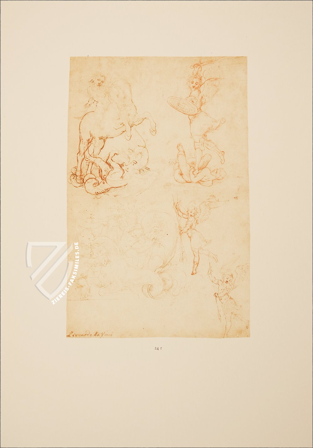 80 Tafeln mit insgesamt 200 Zeichnungen führen die ganze Bandbreite dieses kunsthistorisch so bedeutenden Aspekts der italienischen Renaissance vor Augen. 15 eigenhändige Zeichnungen von Leonardo selbst - davon acht aus dem Metropolitan Museum of Art in New York – geben unter anderem Einblick in Leonardos Studien zum berühmten Mailänder Letzten Abendmahl (entstanden um 1495) und in seine intensive Beschäftigung mit der menschlichen Physiognomie. Das Kompendium enthält außerdem die komplette Serie der Karikaturen aus der Spencer Collection der New York Public Library: 104 Kopien des 16. Jahrhunderts direkt nach den heute verlorenen Originalen von Leonardo da Vinci!