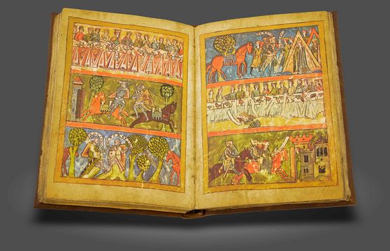 Entstanden lange vor Luther und geschmückt mit über 550 ausdrucksstarken Miniaturen: Die Erzählungen der Bibel und die Weltgeschichte vereint in einer großen Historienbibel von 1467 in deutscher Volkssprache