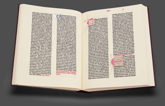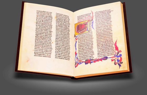 Eines der schönsten erhaltenen Exemplare der epochenverändernden Gutenberg-Bibel: Wunderschöne, handgemalte Zierinitialen und Randilluminationen in der Ausgabe des namensgebenden französischen Kardinals und Bibliophilen Jules Mazarin
