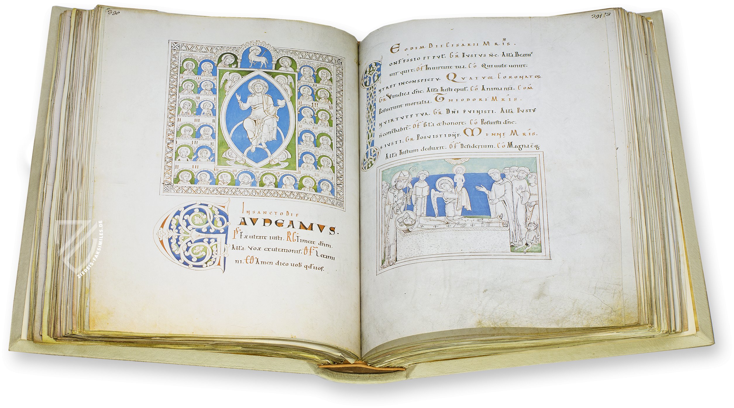 Das Gedenken aller Heiligen brachte verschiedene Bildtypen hervor, die oftmals die entsprechenden Teile von liturgischen Handschriften und Stundenbüchern illuminieren, etwa die Allerheiligenlitanei. Ein wunderbares Beispiel hierfür ist eine prächtig gestaltete Doppelseite des Farnese-Stundenbuchs: Hier sind in goldener Schrift die anzurufenden Heiligen aufgeführt. Während in der unteren Hälfte der Doppelseite die irdische Zelebration des Feiertags dargestellt wird, erscheint oben der Himmel als wolkige Sphäre, aus der Engel hervorkommen und die die Gemeinschaft der Heiligen aufnimmt. Diese gruppiert sich auf jeder Seite um ein leuchtendes Zentrum – links die Dreifaltigkeit, rechts Maria Muttergottes – und wird als eine mit dem Horizont verschmelzende Menschenmasse gezeigt, deren Größe kaum zu erfassen ist.